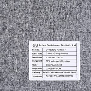 U10001013 2-Layer 50% polyester 50% cation 2/2 twill gabardine fabric P/D+WR+TPU milky membrane WP/MVP: 5K/5K