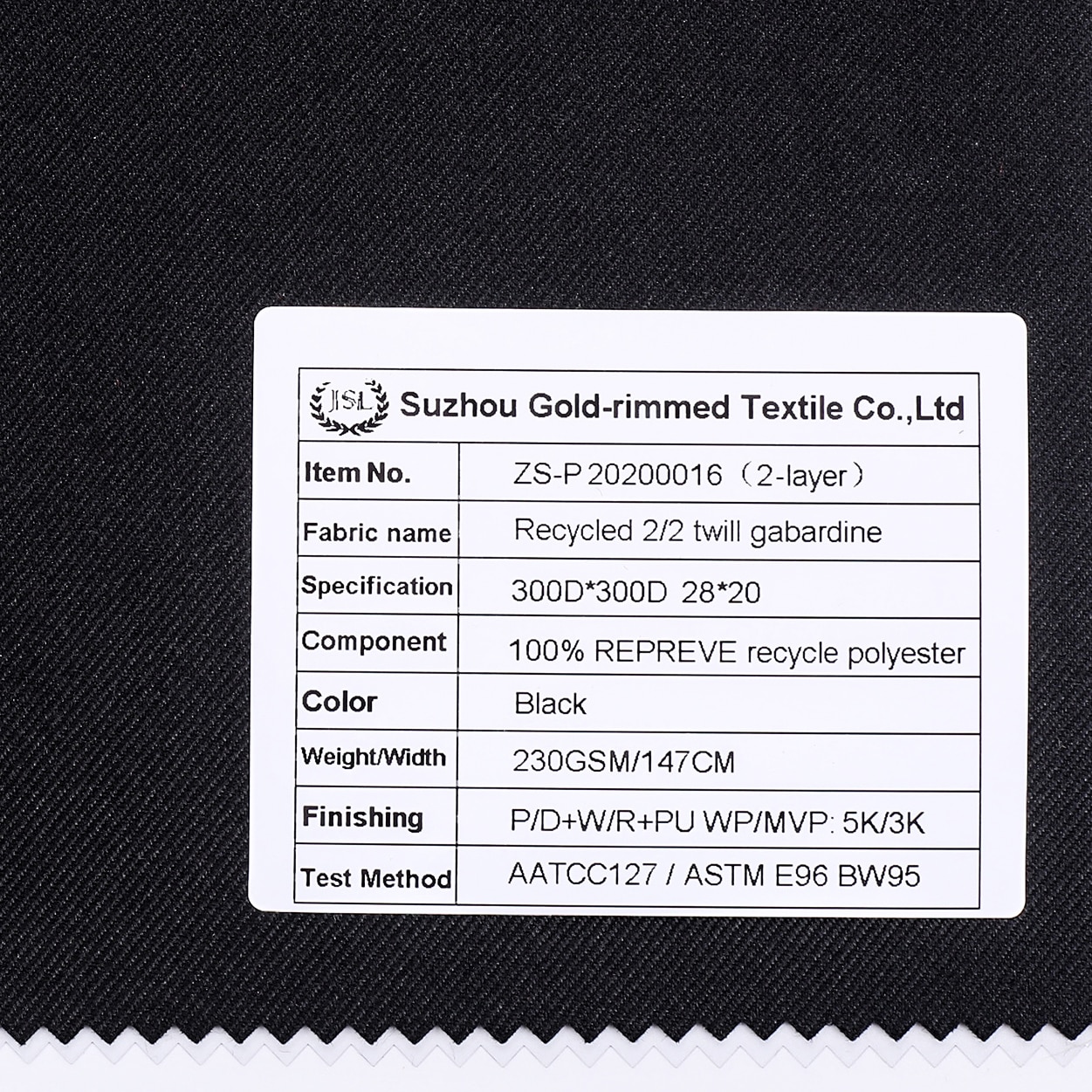 2)Description: Recycled polyester 2/2 twill gabardine fabric with GRS certificated P/D+W/R+PU coating WP/MVP: 5K/3K,used for Jacket,Hardshell,Outdoor Clothing,etc.