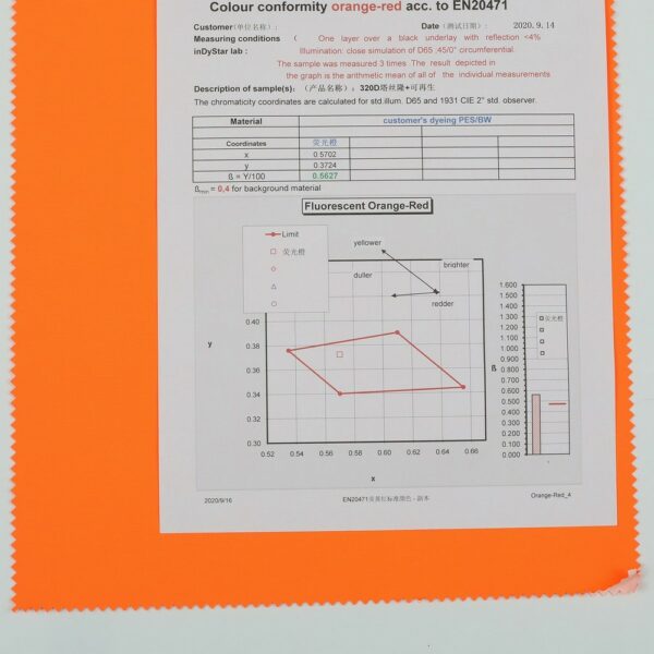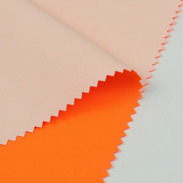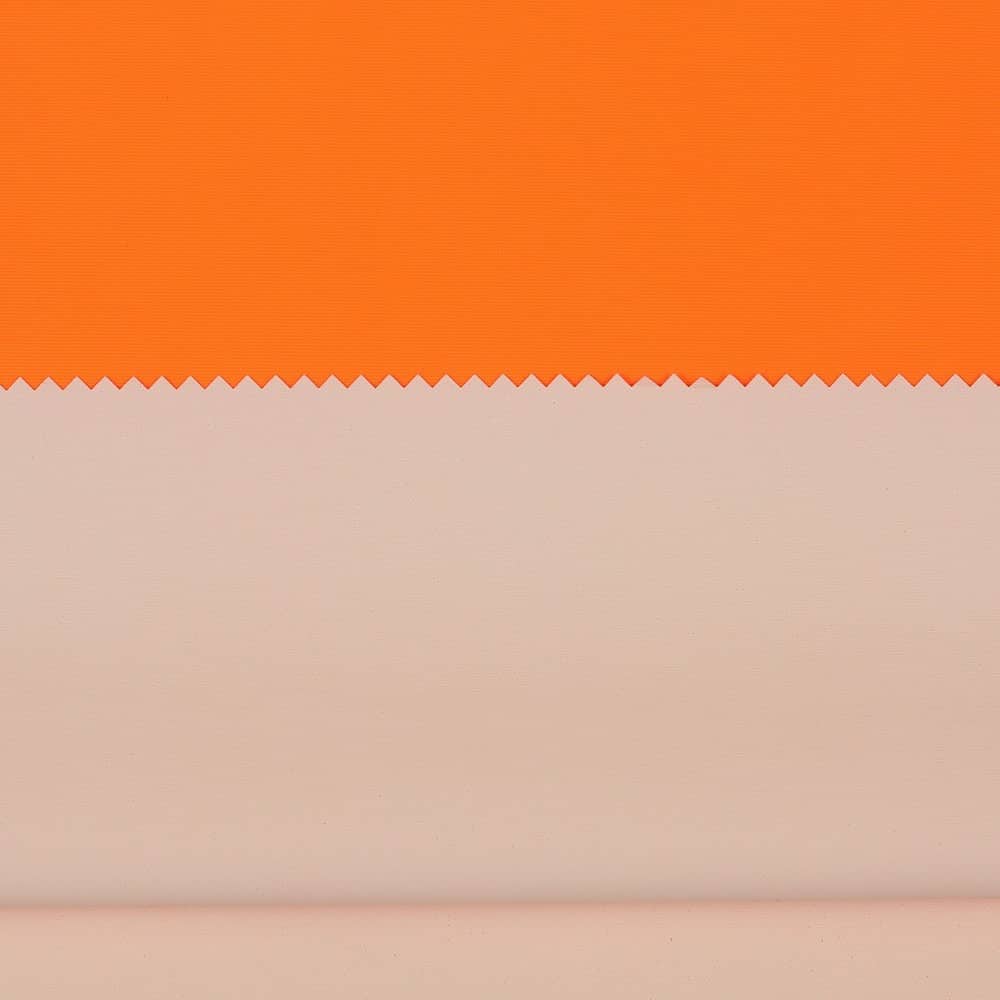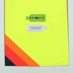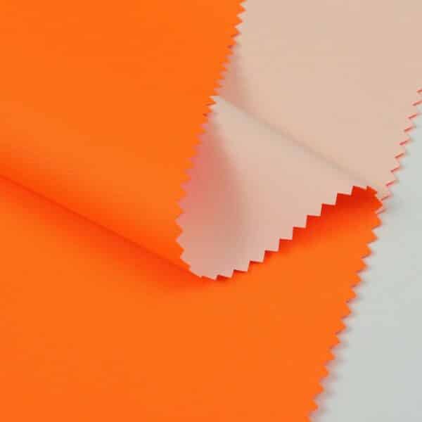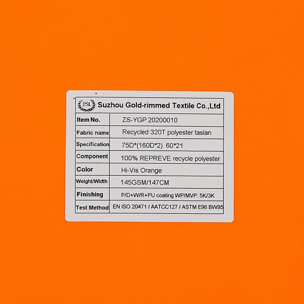 This is GRS certificated recycled fabric and meet with EN 20471 ,its face material is a recycled polyester taslan fluorescent fabric with water-repellent finish,its back material is a waterproof Polyurethane coating.It is water and wind resistant,waterproof,durable,ideal for high visibility clothing,workwear,personal protective equipment,etc.