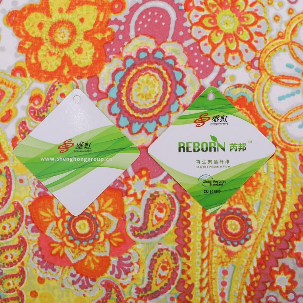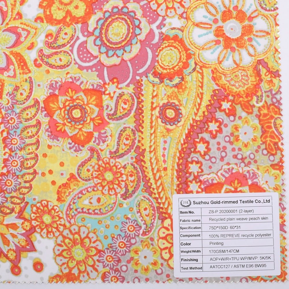 2)Description: 2-Layer Recycled plain weave peach skin fabric with GRS certificated AOP+W/R+TPU WP/MVP: 5K/5K,used for Jacket,Hardshell,Outdoor Clothing,etc.