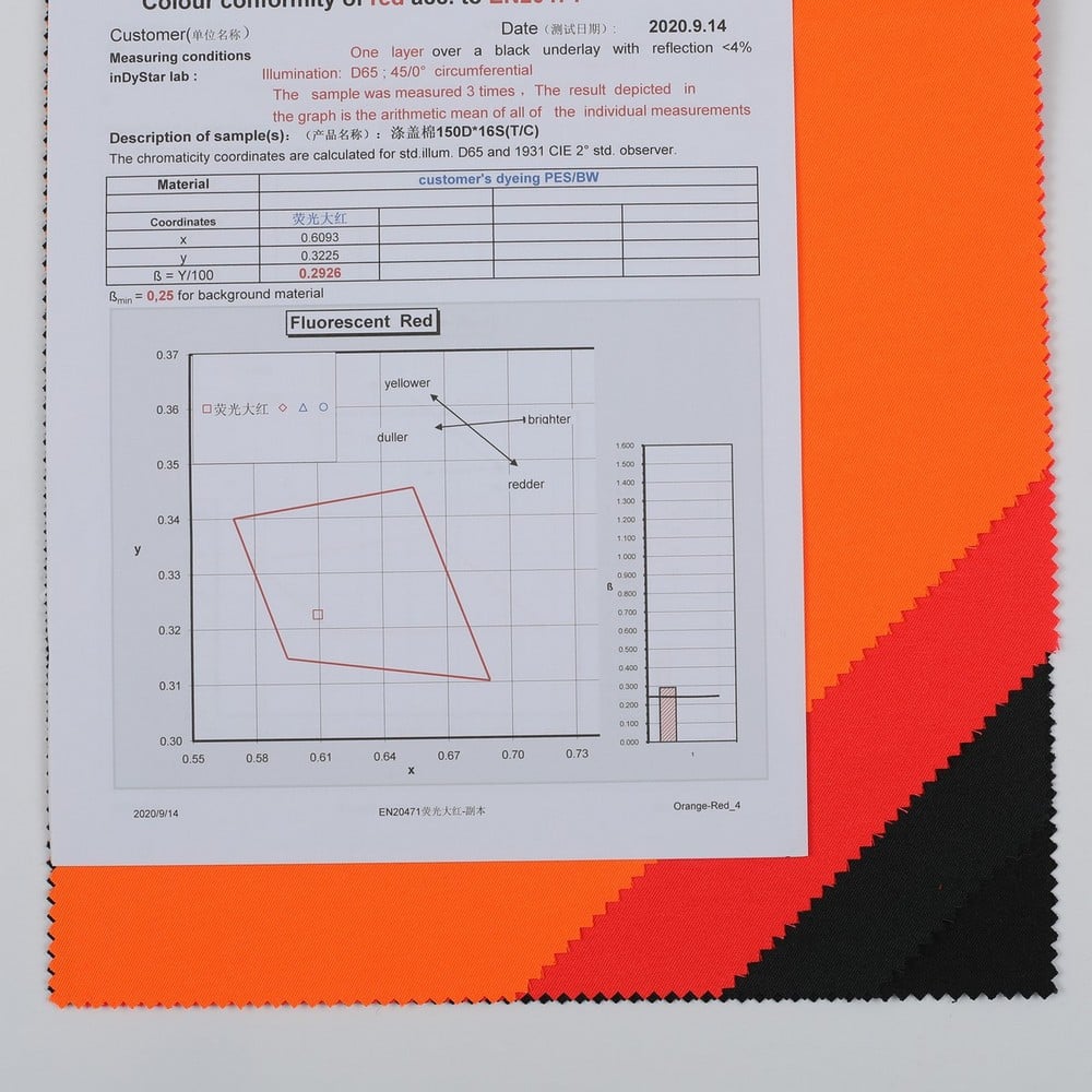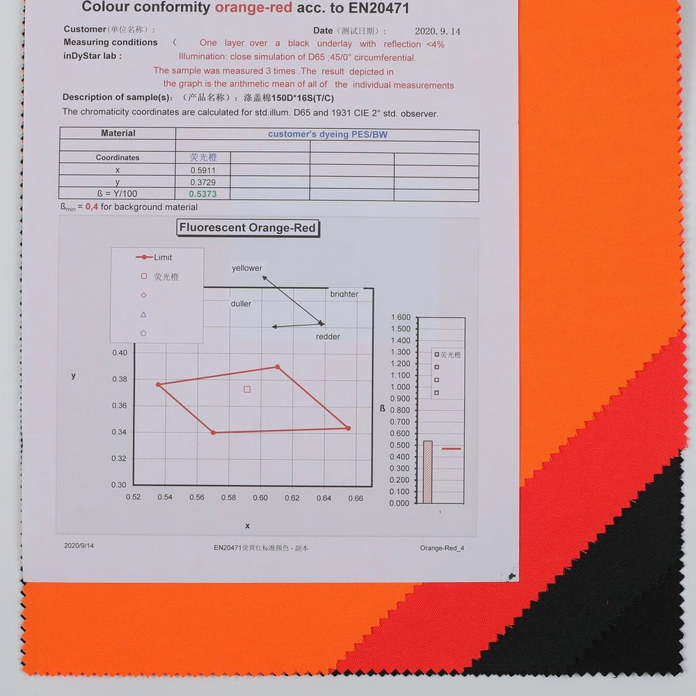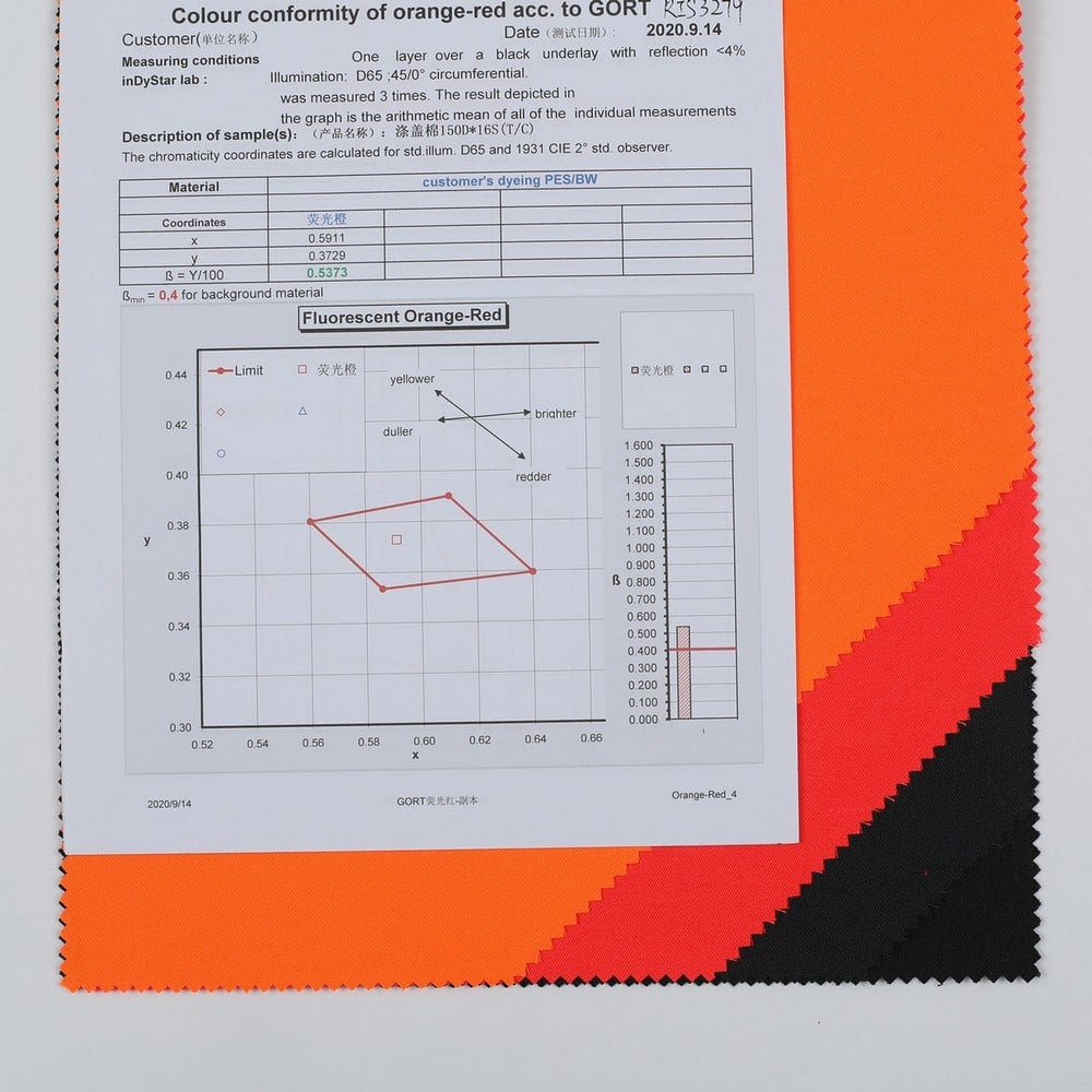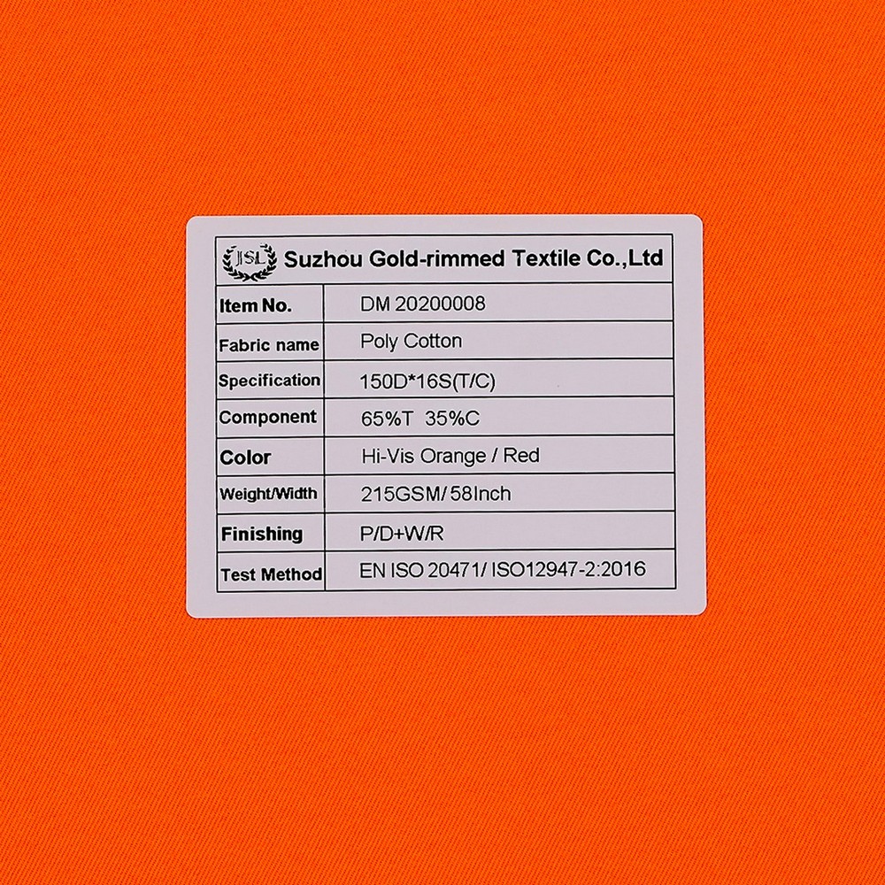 This Poly cotton high visibility fabric is made using the high quality cotton and dyestuff, and with Gold-rimmed’s unique processing. Available in fluoresent yellow,fluoresent organge,fluoresent red color meet the requirements of EN20471 and high abrasion resistance meet ISO12947-2:2016. The poly cotton high visibility fabric also has flame retardant and antistatic property, adopt unique FR treatment to ensure high visibility property and good color fastness to light, meanwhile ensure low formaldehyde content. This poly cotton high visibility fabric is popular in Europe and used for workwear,High Visibility Clothing, coal mine garment, railway uniform etc..