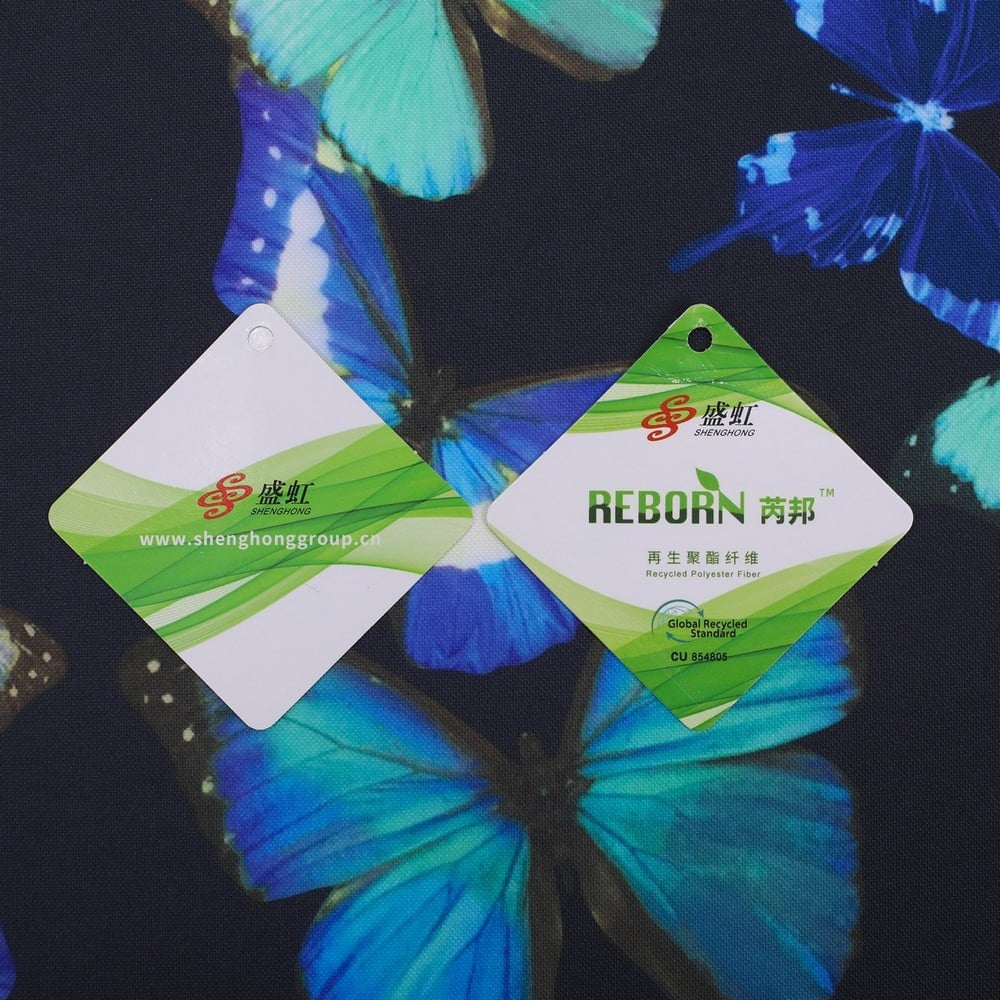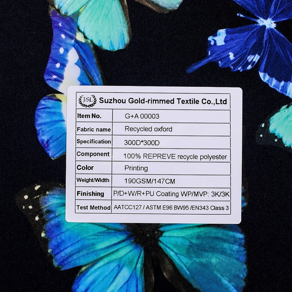 2)Description: Recycled polyester oxford fabric with GRS certificated AOP+W/R+PU coating WP/MVP: 3K/3K,used for Jacket,Hardshell,Outdoor Clothing,etc.