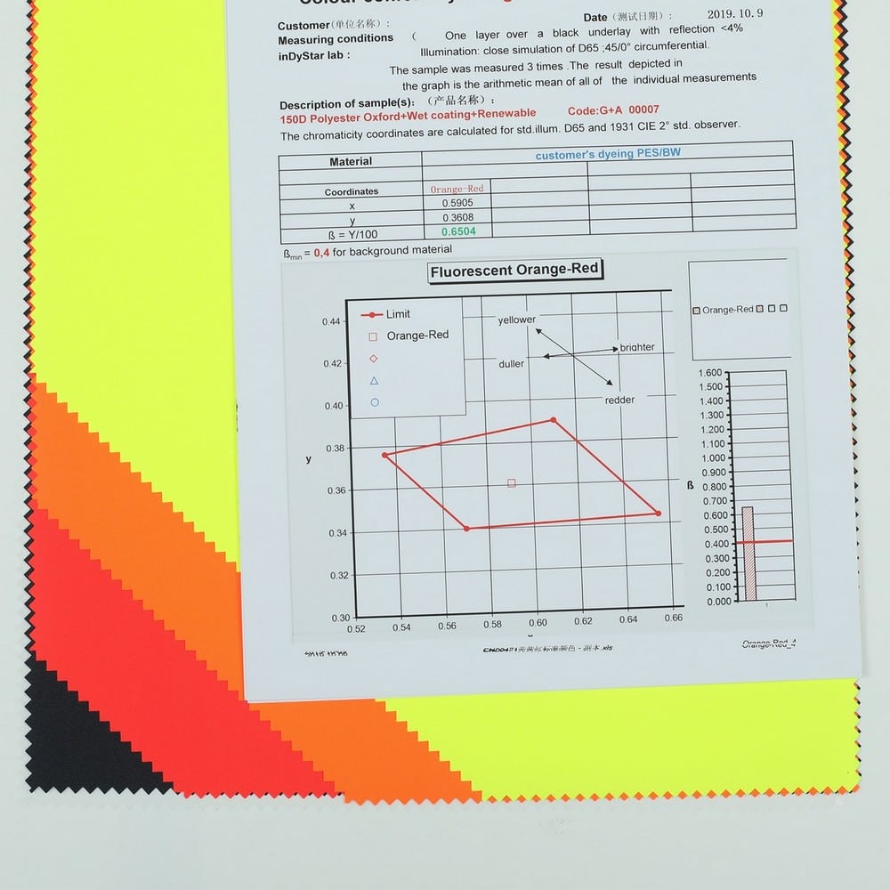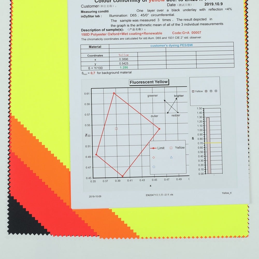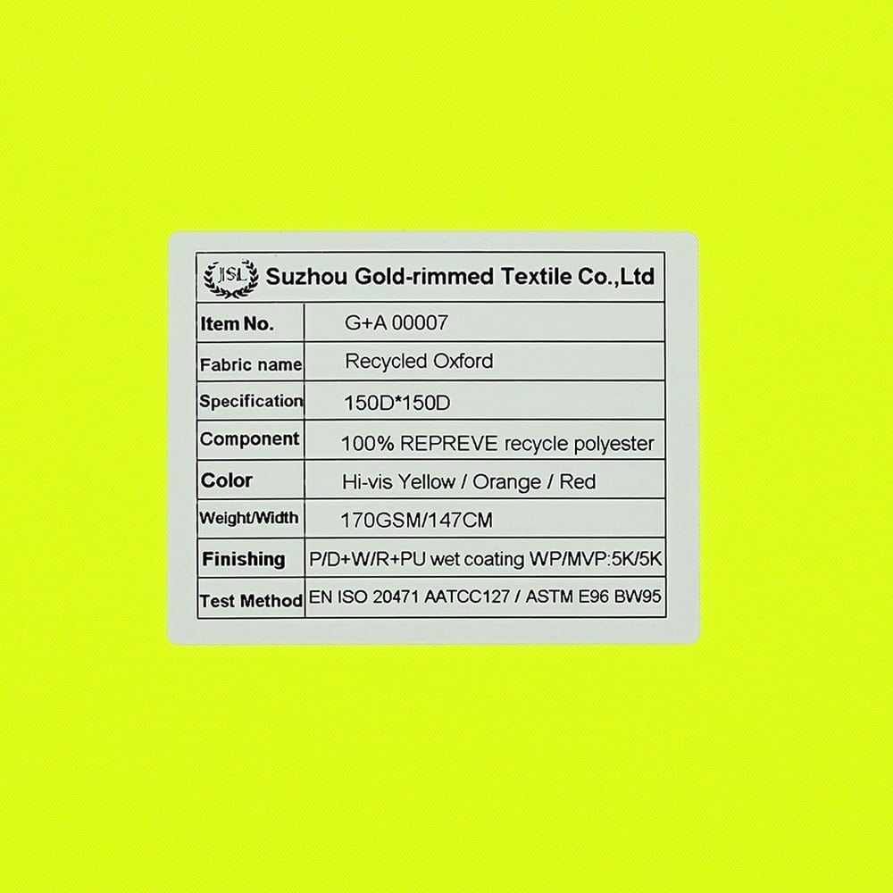This is GRS certificated recycled fabric and meet with EN 20471 ,its face material is a recycled polyester oxford fluorescent fabric with water-repellent finish,its back material is a waterproof Polyurethane wet coating.It is water and wind resistant,waterproof,breathable,durable,ideal for high visibility clothing,workwear,personal protective equipment,etc.