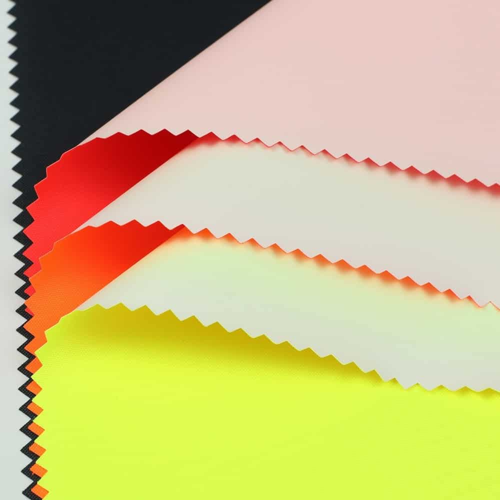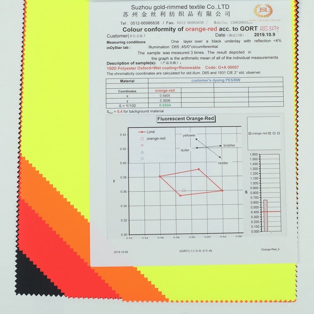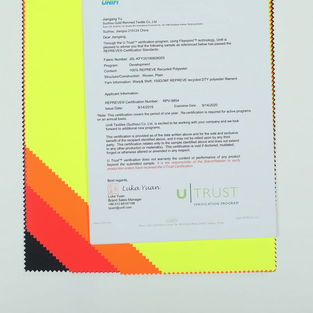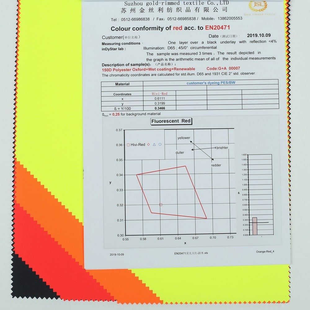 This is GRS certificated recycled fabric and meet with EN 20471 ,its face material is a recycled polyester oxford fluorescent fabric with water-repellent finish,its back material is a waterproof Polyurethane wet coating.It is water and wind resistant,waterproof,breathable,durable,ideal for high visibility clothing,workwear,personal protective equipment,etc.
