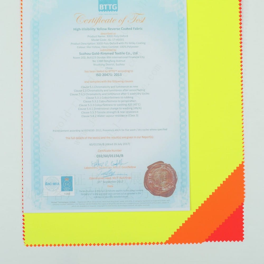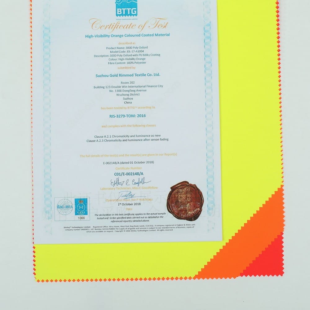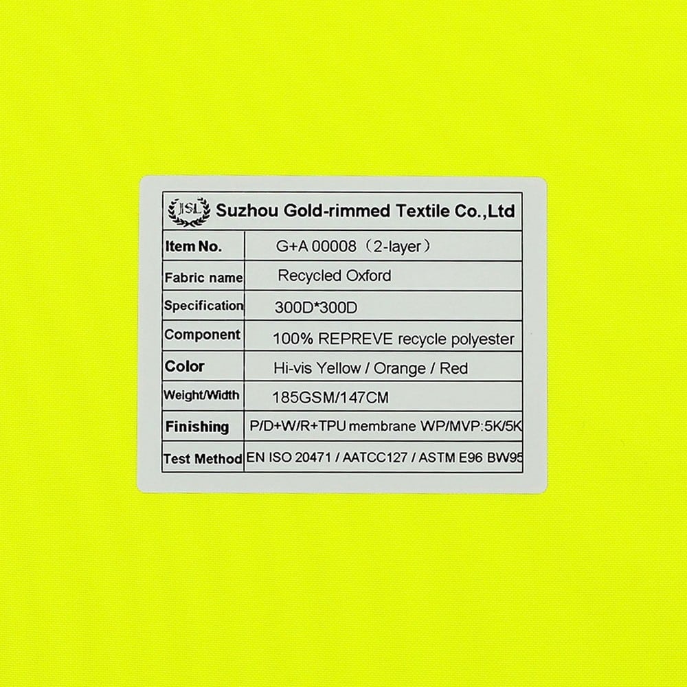 This is GRS certificated recycled fabric and meet with EN 20471 ,its face material is a recycled polyester oxford fluorescent fabric with water-repellent finish,its back material is a waterproof Polyurethane wet coating.It is water and wind resistant,waterproof,breathable,durable,ideal for high visibility clothing,workwear,personal protective equipment,etc.