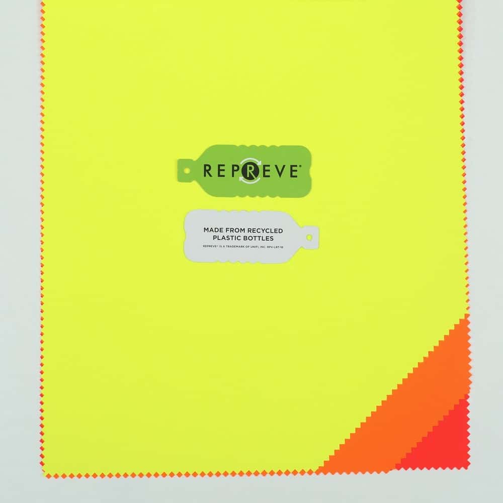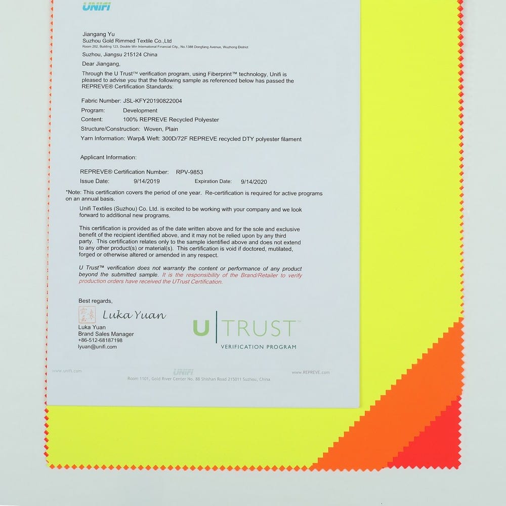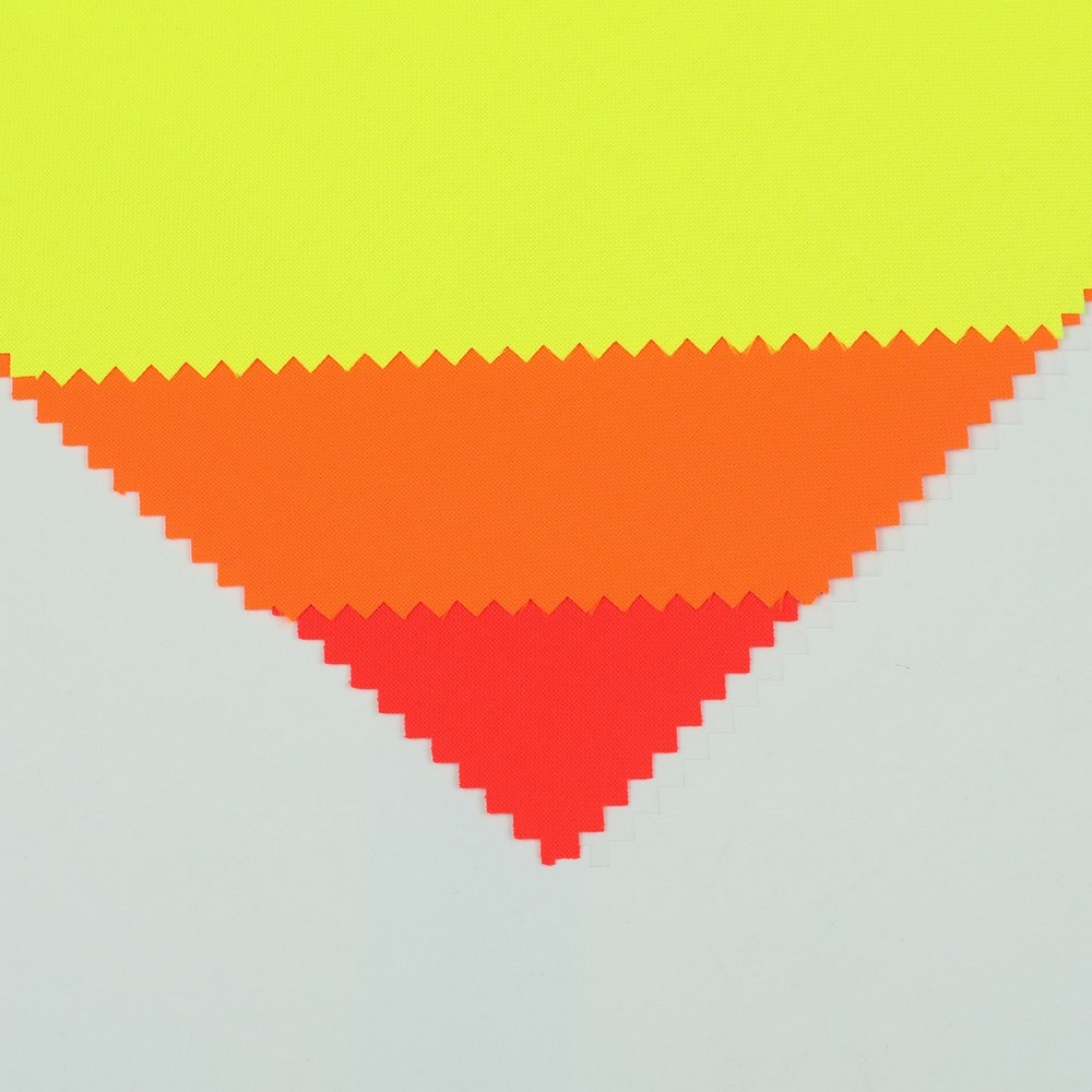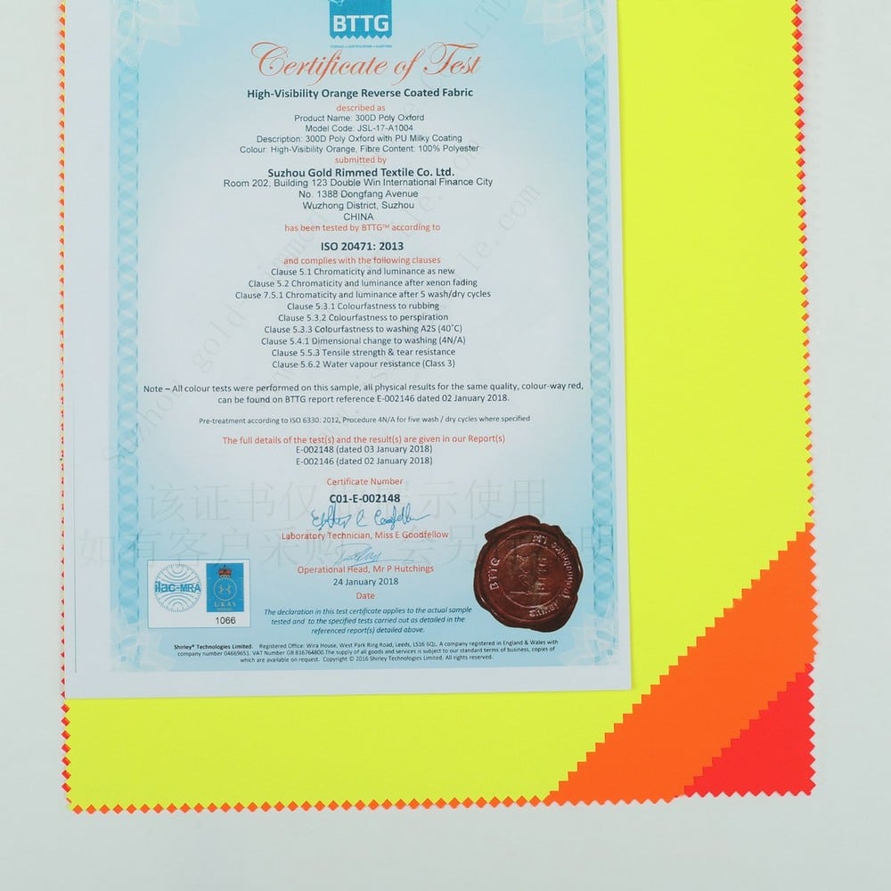 This is GRS certificated recycled fabric and meet with EN 20471 ,its face material is a recycled polyester oxford fluorescent fabric with water-repellent finish,its back material is a waterproof Polyurethane wet coating.It is water and wind resistant,waterproof,breathable,durable,ideal for high visibility clothing,workwear,personal protective equipment,etc.