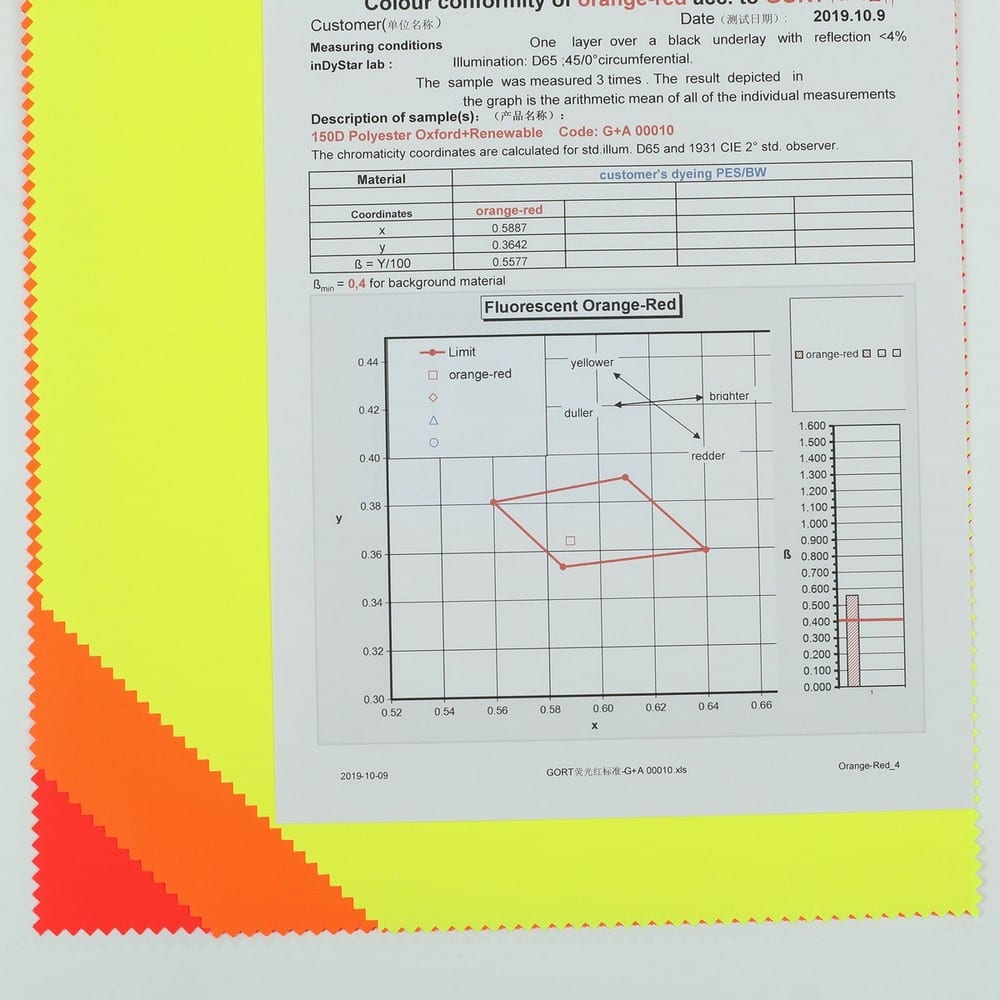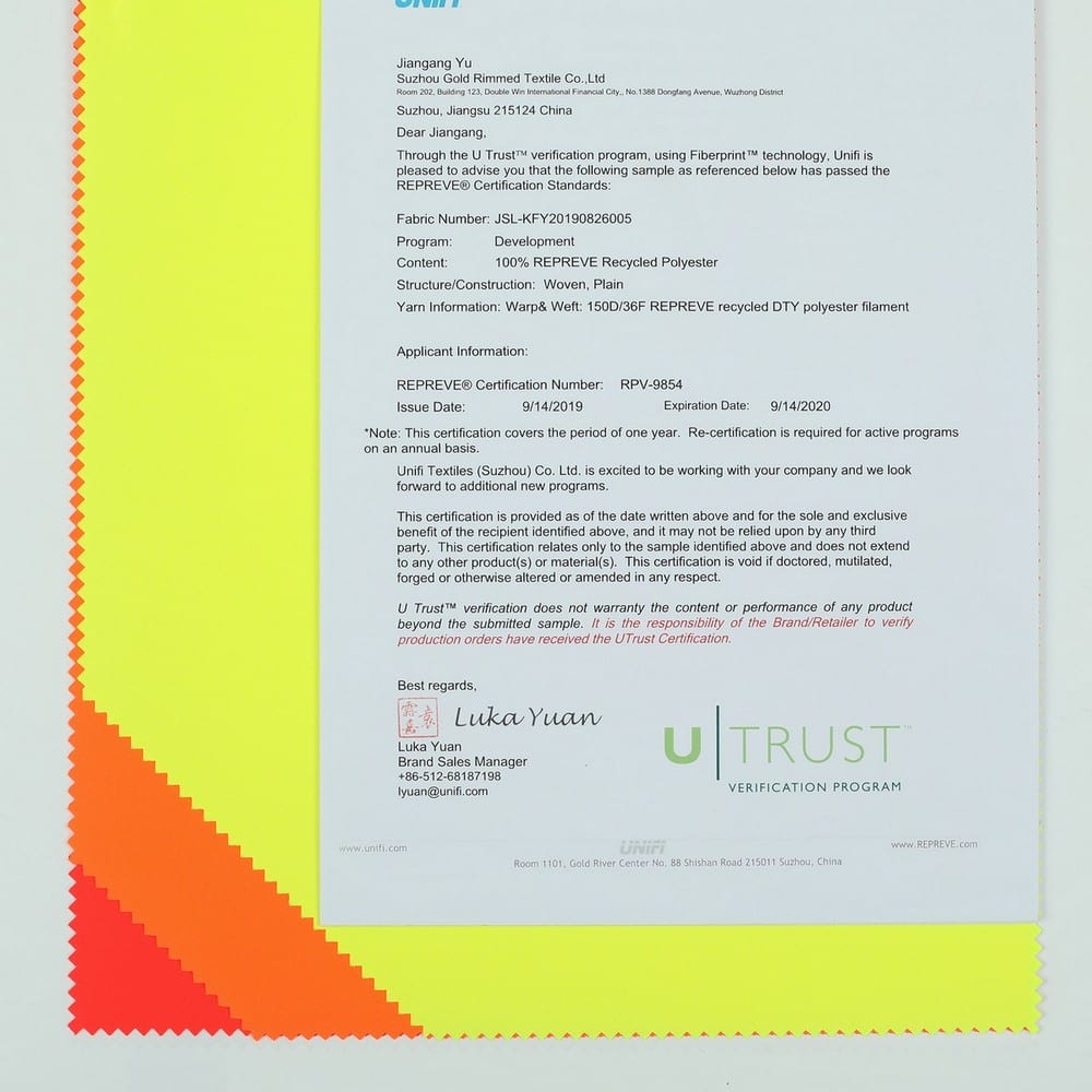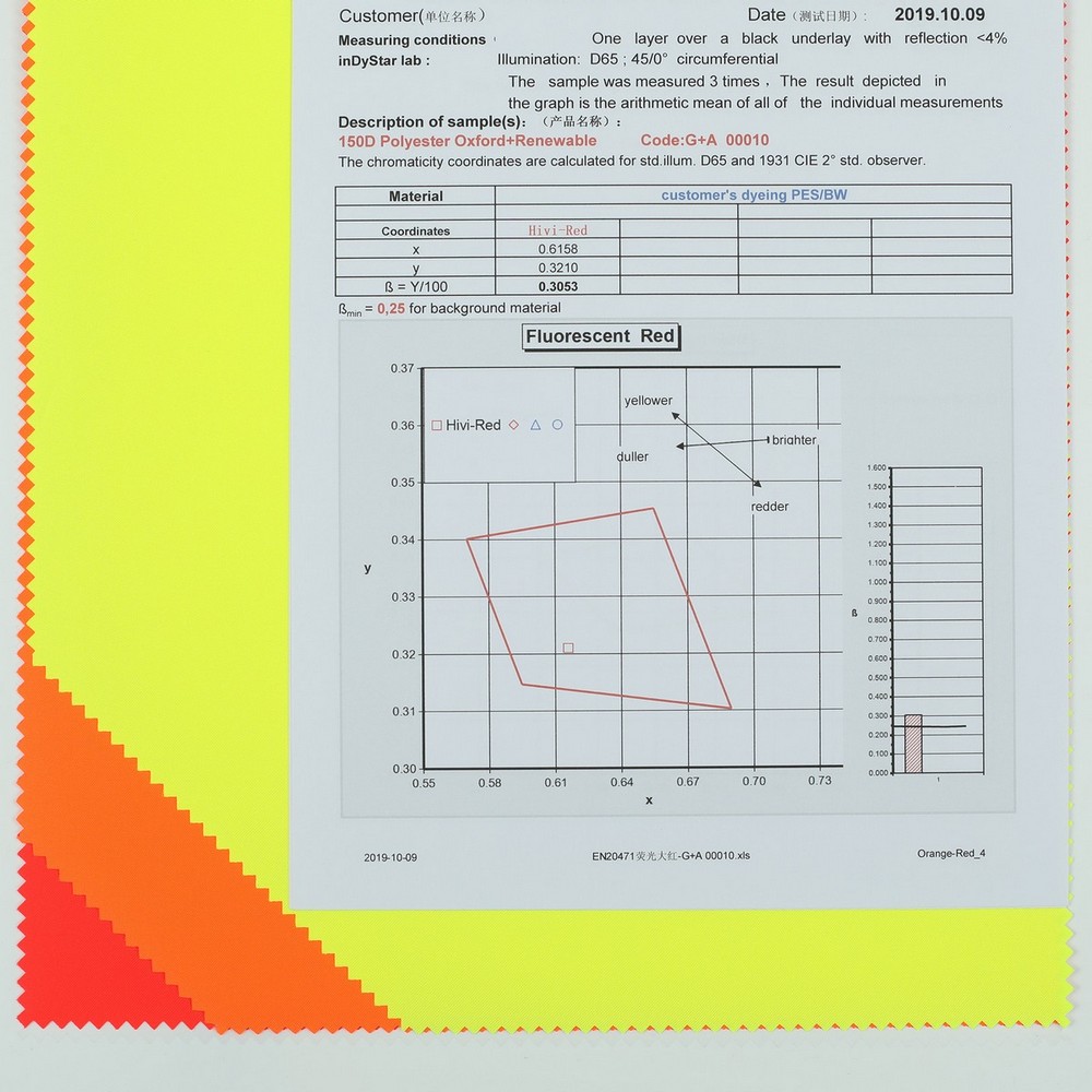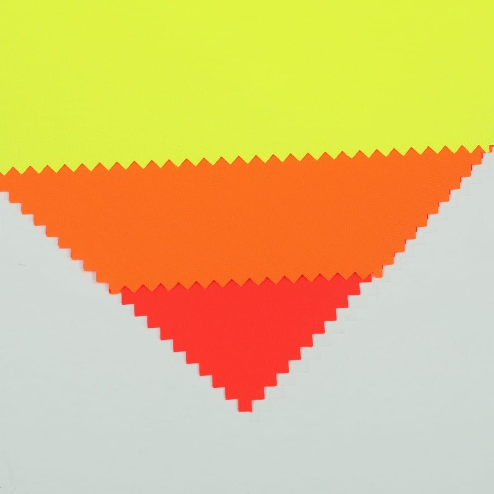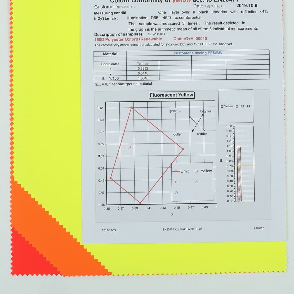 This is GRS certificated recycled fabric and meet with EN 20471 ,its face material is a recycled polyester oxford fluorescent fabric with water-repellent finish,its back material is a waterproof Polyurethane wet coating.It is water and wind resistant,waterproof,breathable,durable,ideal for high visibility clothing,workwear,personal protective equipment,etc.