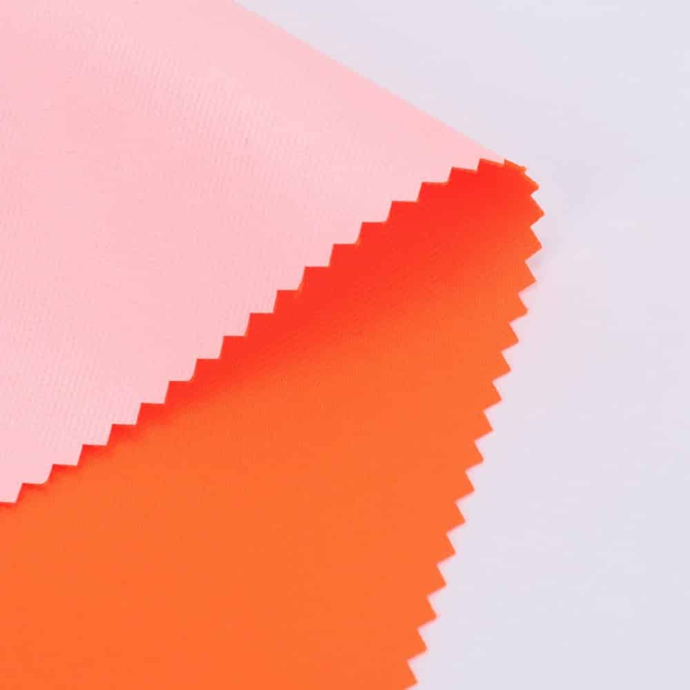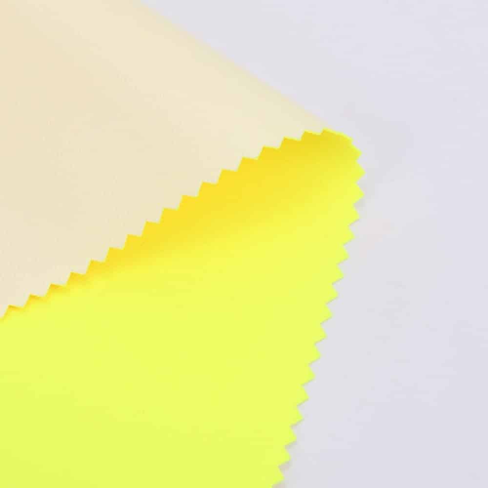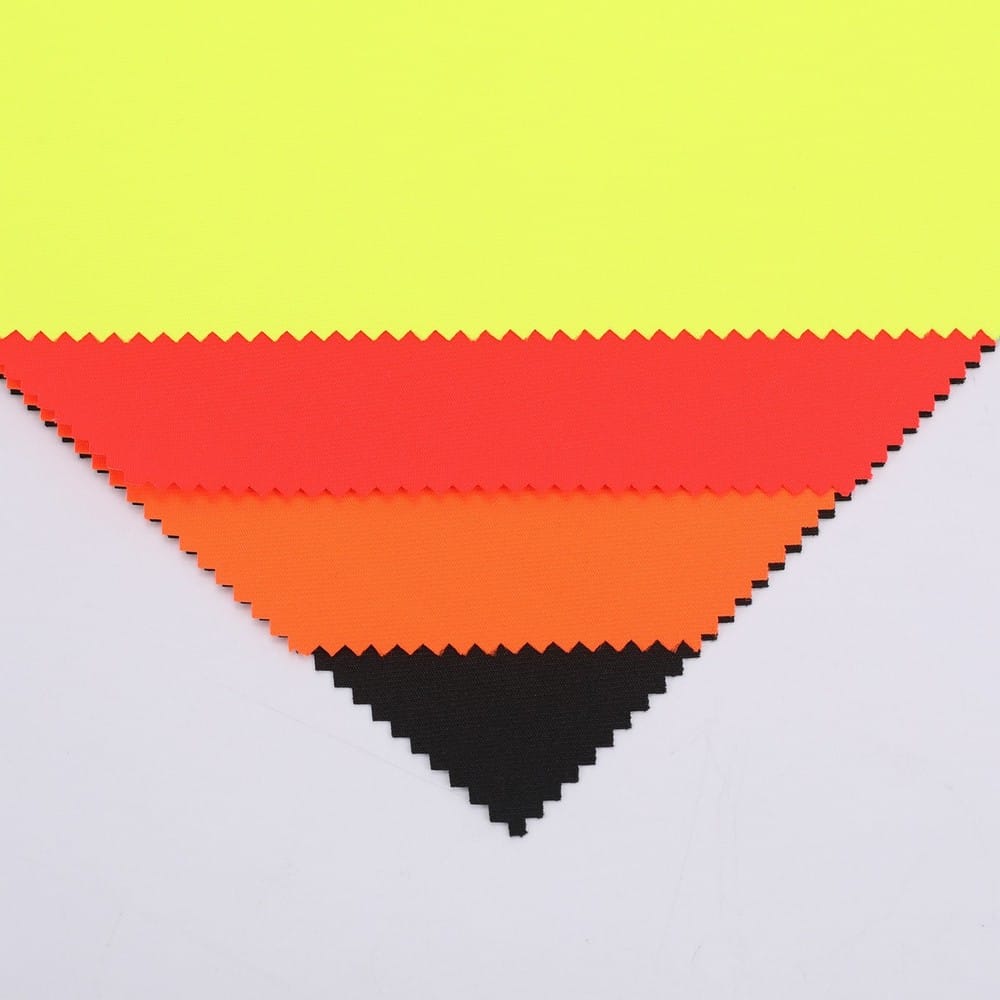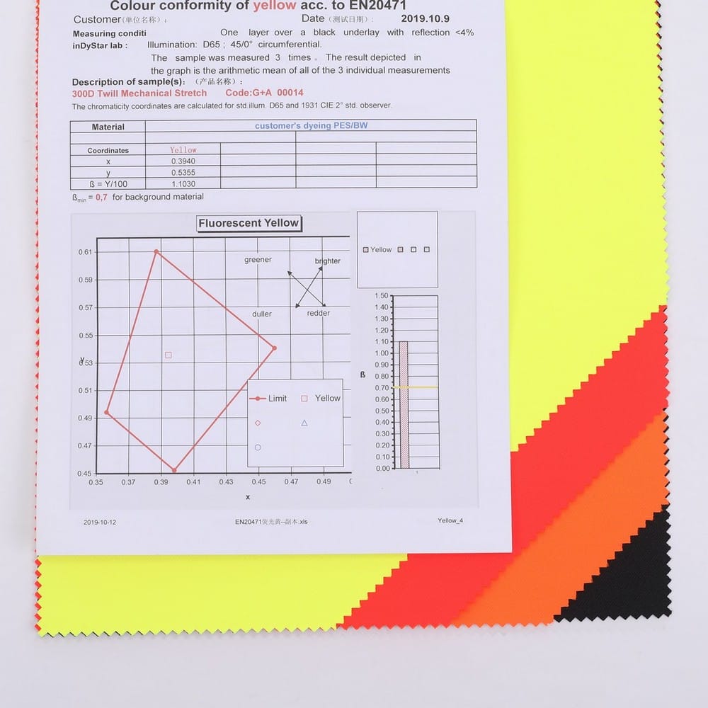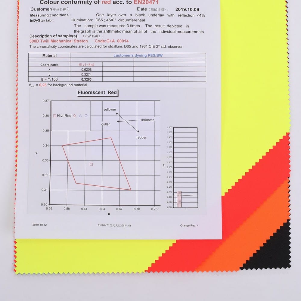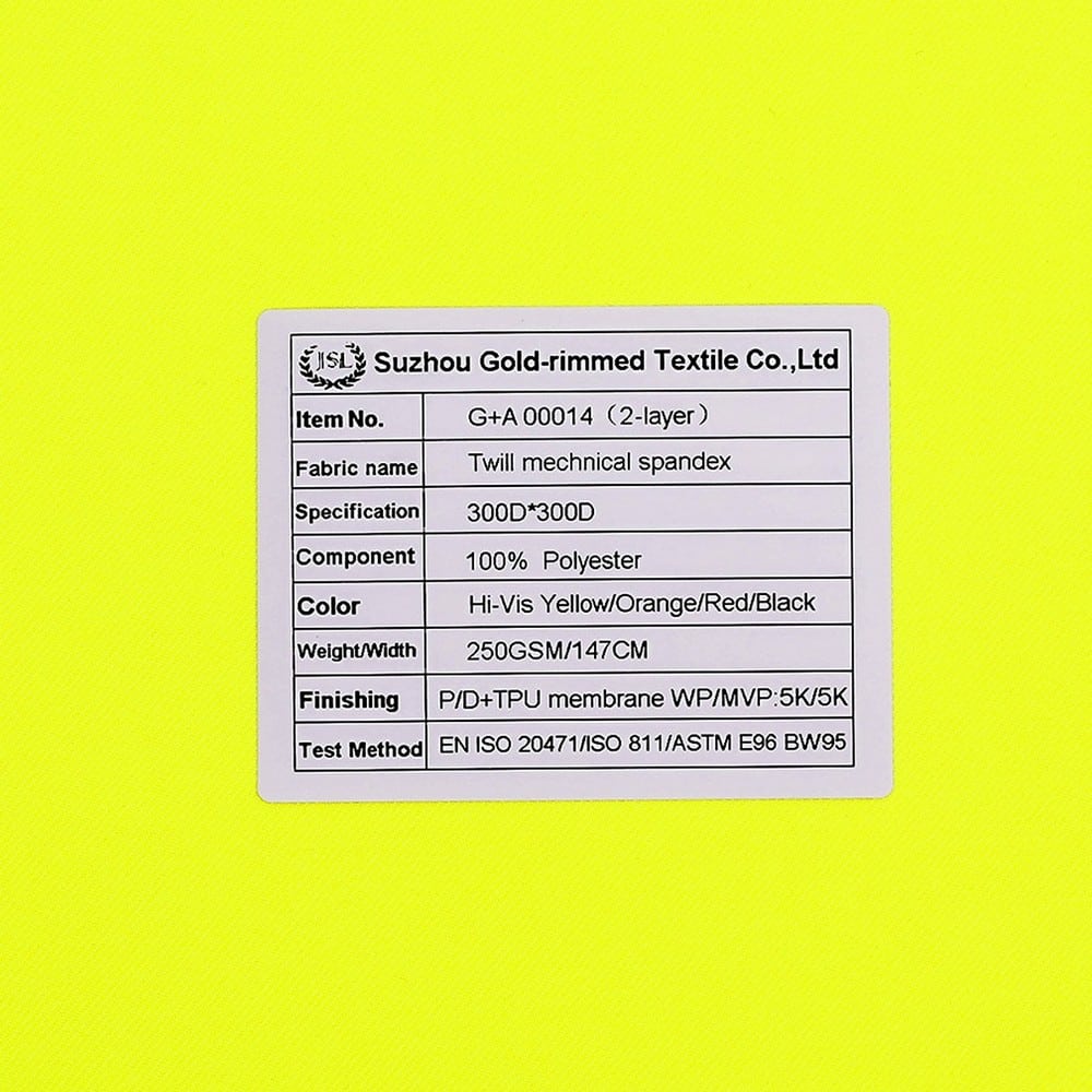 This is 2-Layer Twill mechnical spandex fabric and meet with EN 20471 ,its face material is a Twill mechnical spandex fabric fluorescent fabric with water-repellent finish,its back material is a waterproof and breathable TPU membrane WP/MVP:5K/5K.It is water and wind resistant,waterproof,breathable,durable,ideal for high visibility clothing,workwear,personal protective equipment,etc.