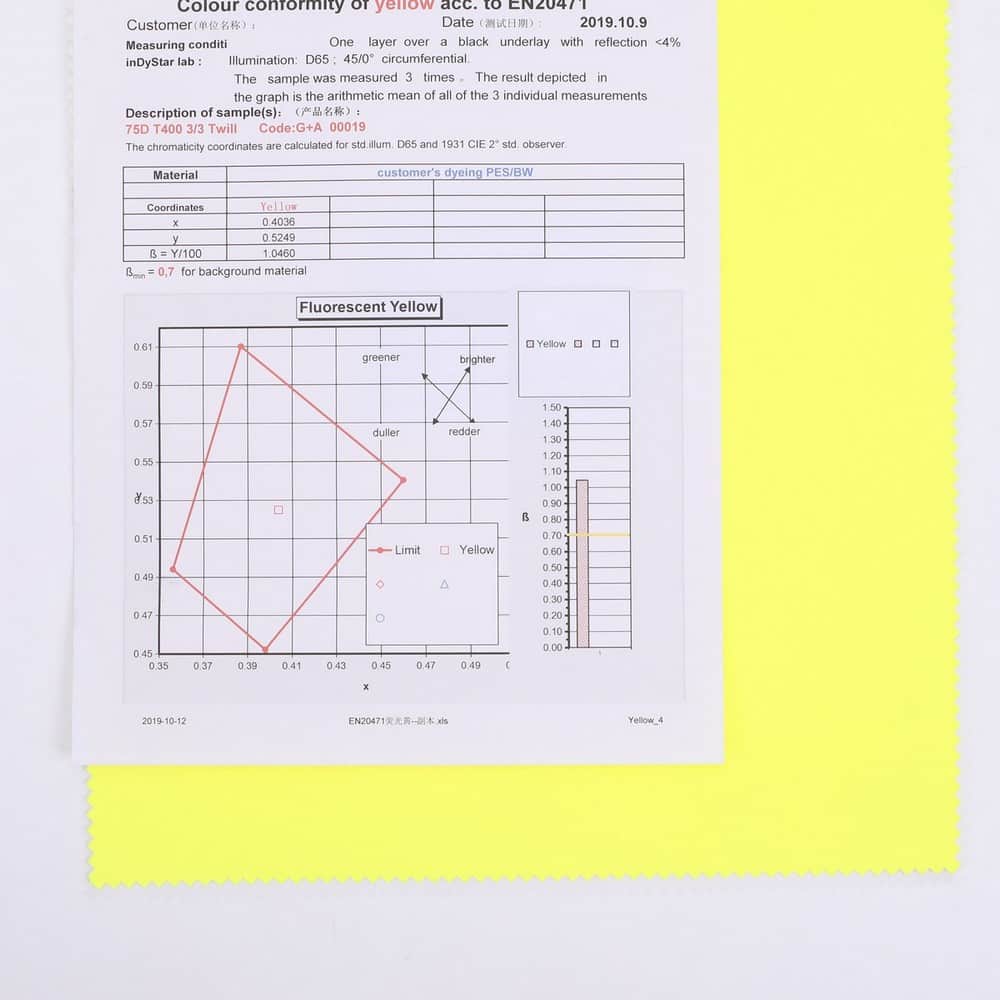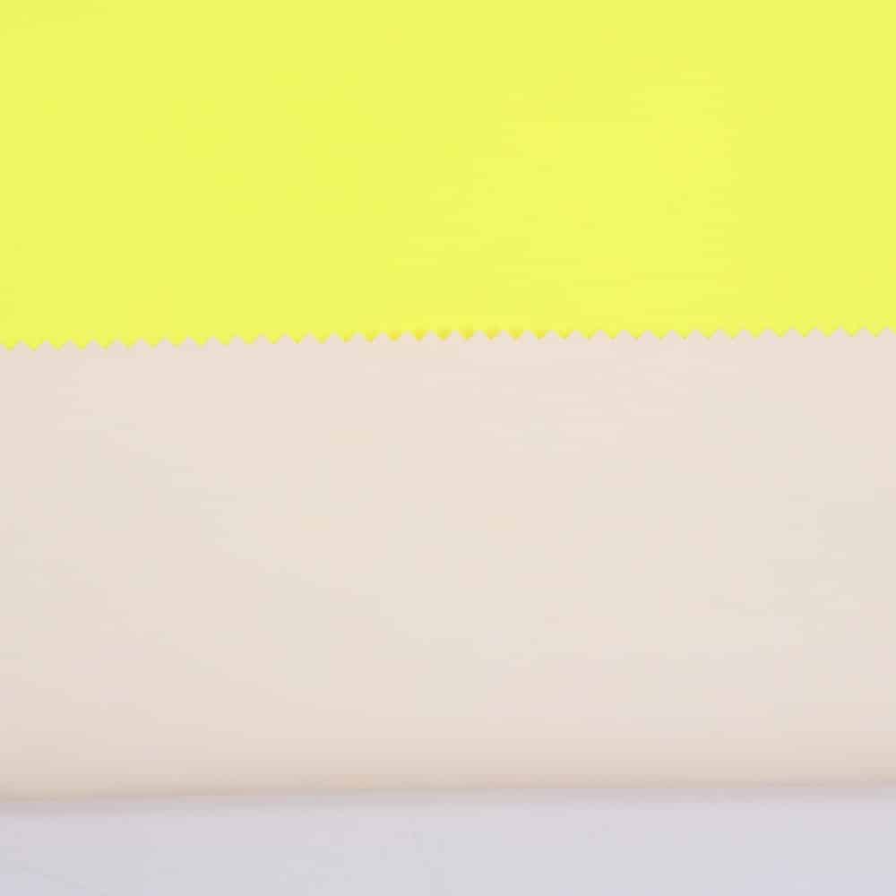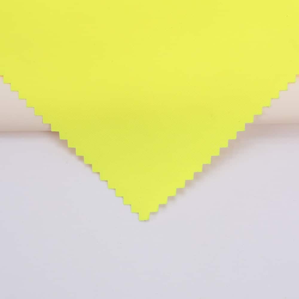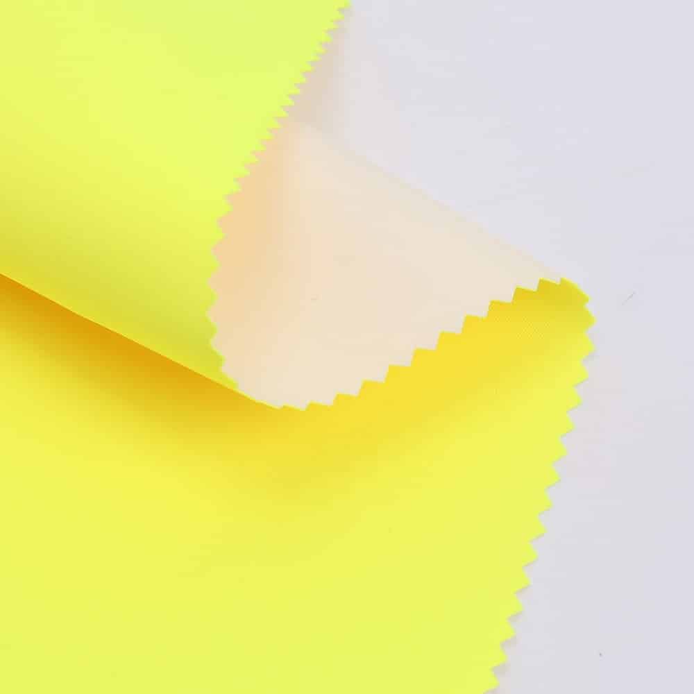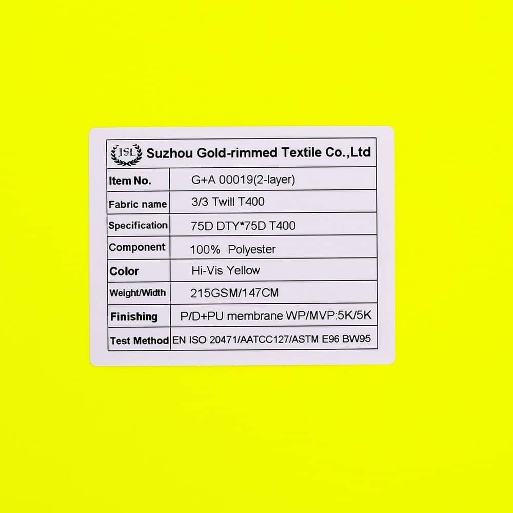 This is 2-Layer 3/3 Twill T400 fabric and meet with EN 20471 ,its face material is a 3/3 Twill T400 fabric fluorescent fabric with water-repellent finish,its back material is a waterproof and breathable PU membrane WP/MVP:5K/5K.It is water and wind resistant,waterproof,breathable,durable,ideal for high visibility clothing,workwear,personal protective equipment,etc.