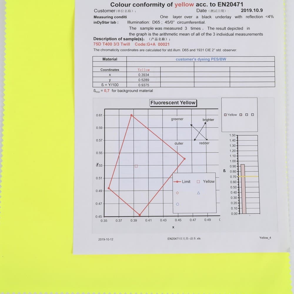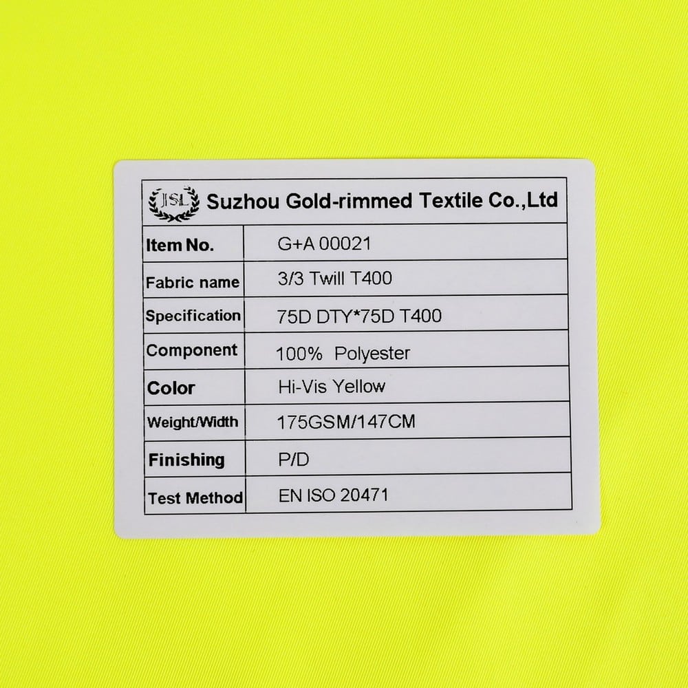 This is 2-Layer 3/3 Twill T400 fabric and meet with EN 20471 ,its face material is a 3/3 Twill T400 fabric fluorescent fabric with water-repellent finish.It is water and wind resistant,waterproof,breathable,durable,ideal for high visibility clothing,workwear,personal protective equipment,etc.It will require a 3rd protective layer or tricot,mesh or fleece for most applications.