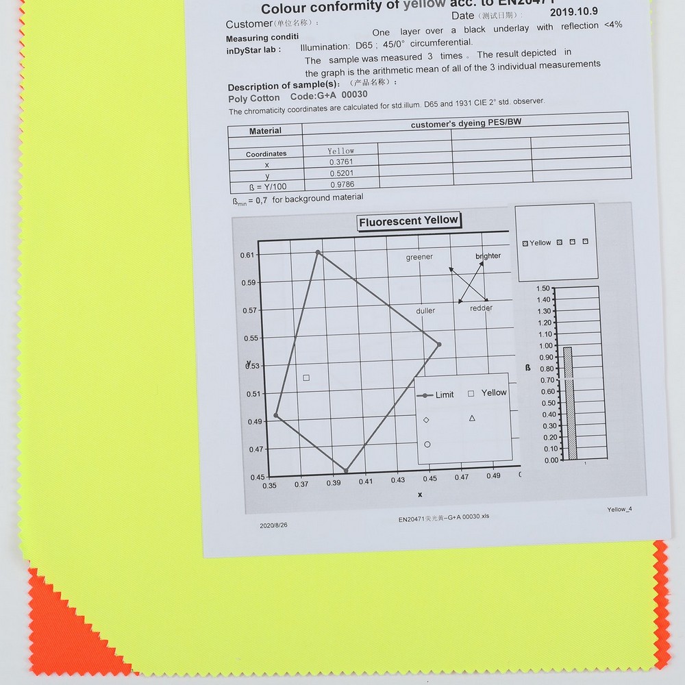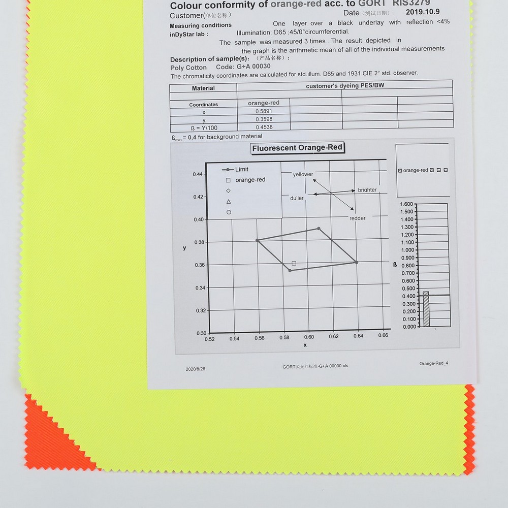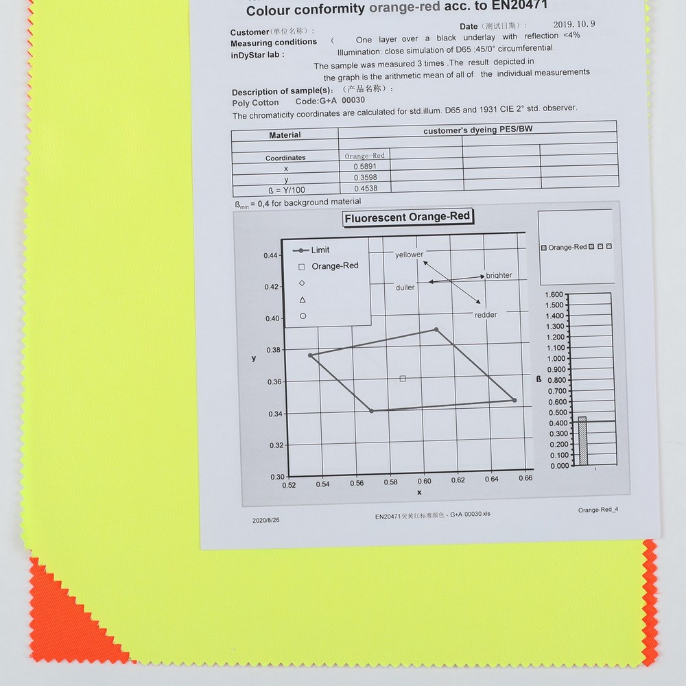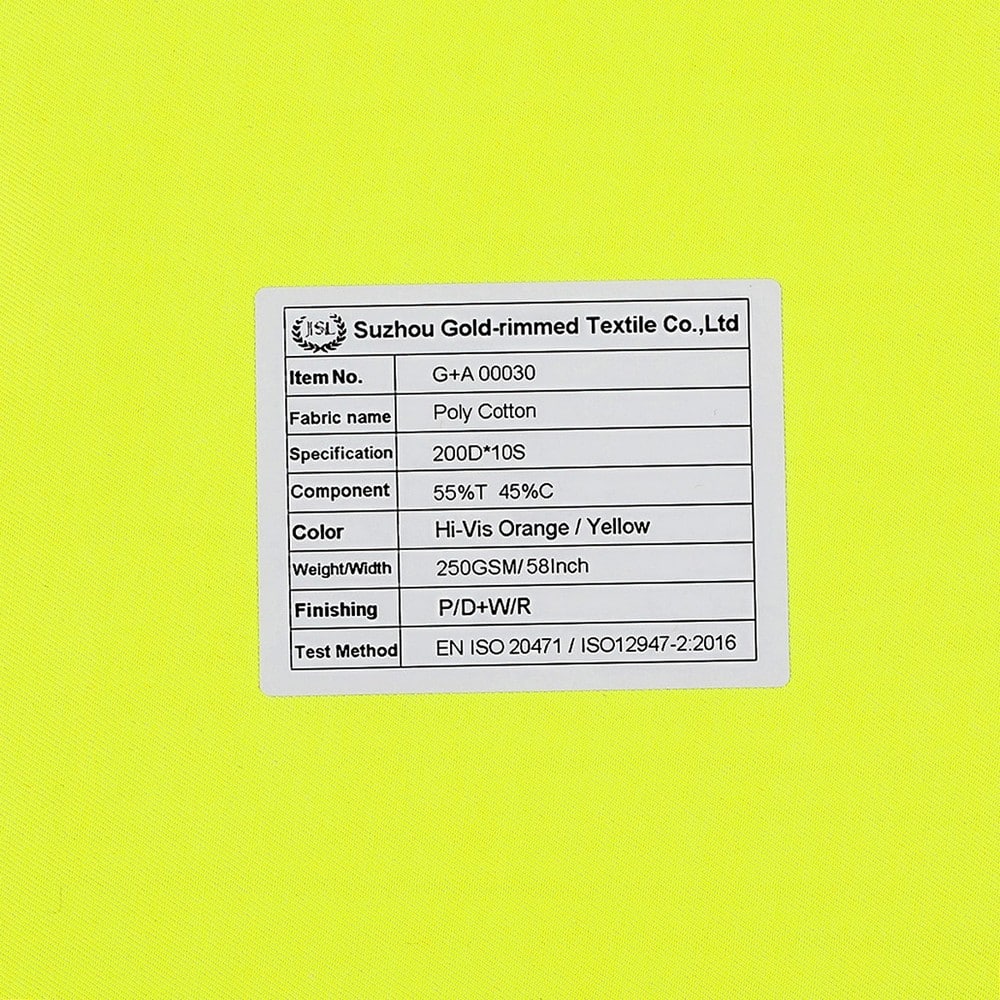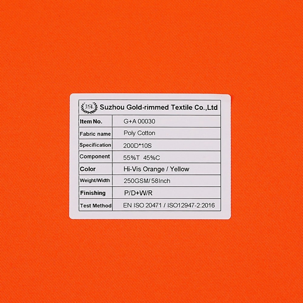 This Poly cotton high visibility fabric is made using the high quality cotton and dyestuff, and with Gold-rimmed’s unique processing. Available in fluoresent yellow,fluoresent organge,fluoresent red color meet the requirements of EN20471 and high abrasion resistance meet ISO12947-2:2016. The poly cotton high visibility fabric also has flame retardant and antistatic property, adopt unique FR treatment to ensure high visibility property and good color fastness to light, meanwhile ensure low formaldehyde content. This poly cotton high visibility fabric is popular in Europe and used for workwear,High Visibility Clothing, coal mine garment, railway uniform etc..