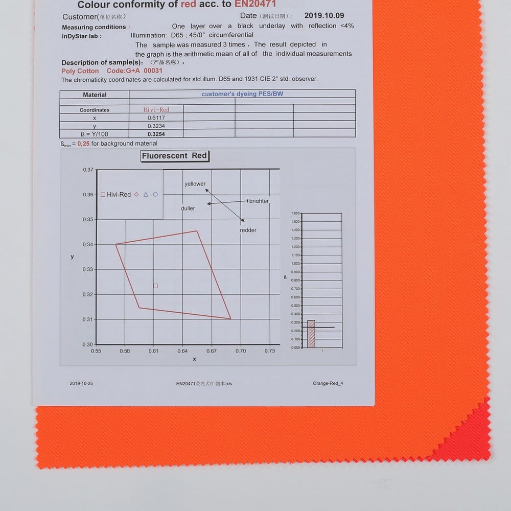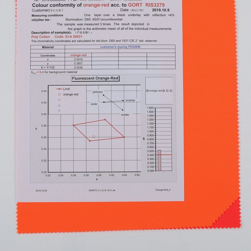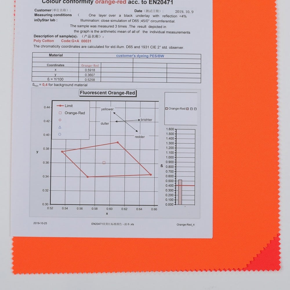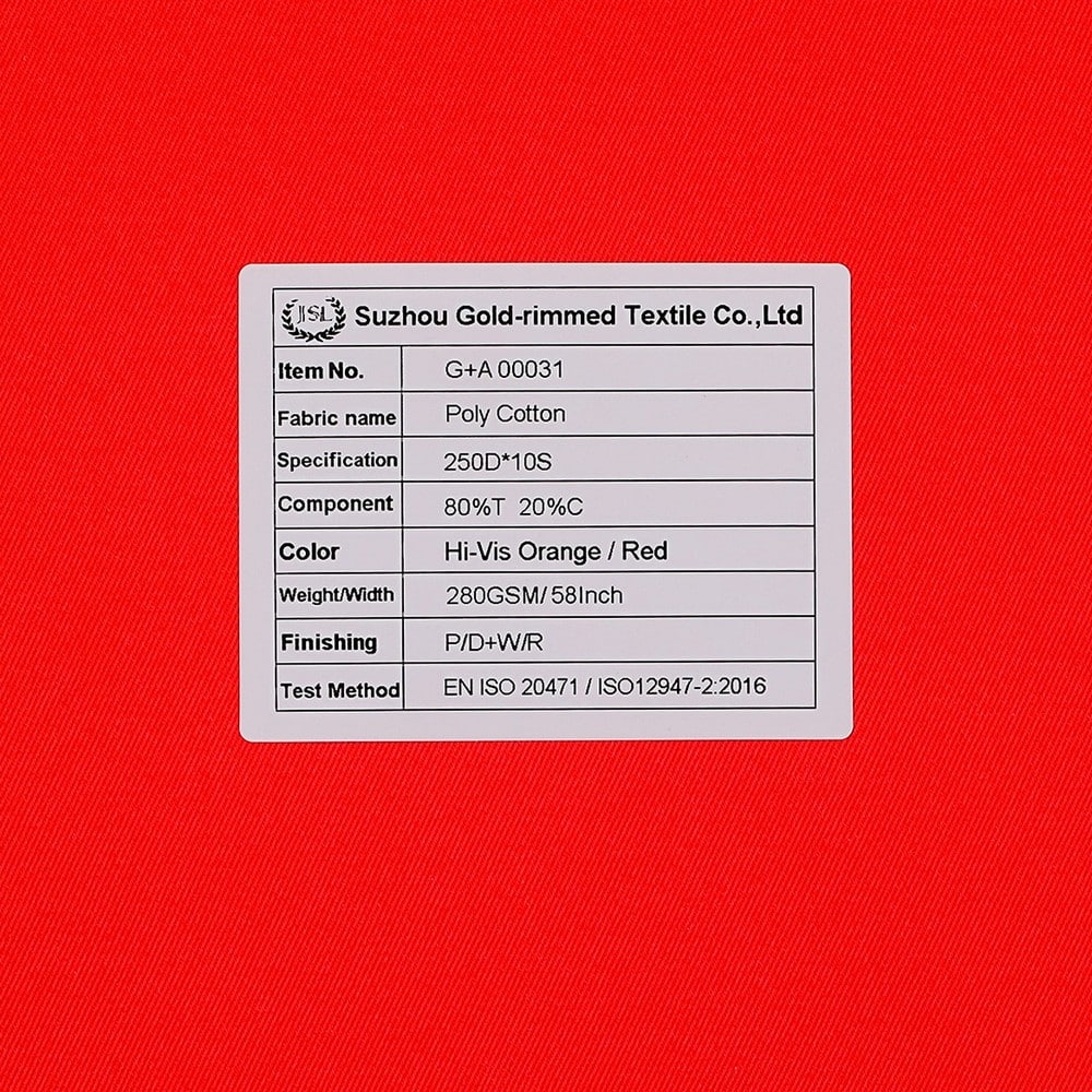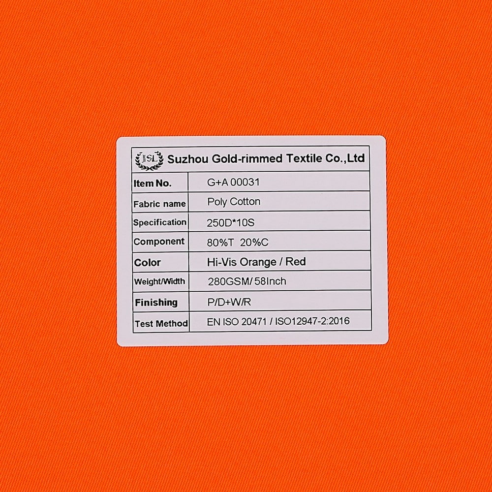 This Poly cotton high visibility fabric is made using the high quality cotton and dyestuff, and with Gold-rimmed’s unique processing. Available in fluoresent yellow,fluoresent organge,fluoresent red color meet the requirements of EN20471 and high abrasion resistance meet ISO12947-2:2016. The poly cotton high visibility fabric also has flame retardant and antistatic property, adopt unique FR treatment to ensure high visibility property and good color fastness to light, meanwhile ensure low formaldehyde content. This poly cotton high visibility fabric is popular in Europe and used for workwear,High Visibility Clothing, coal mine garment, railway uniform etc..