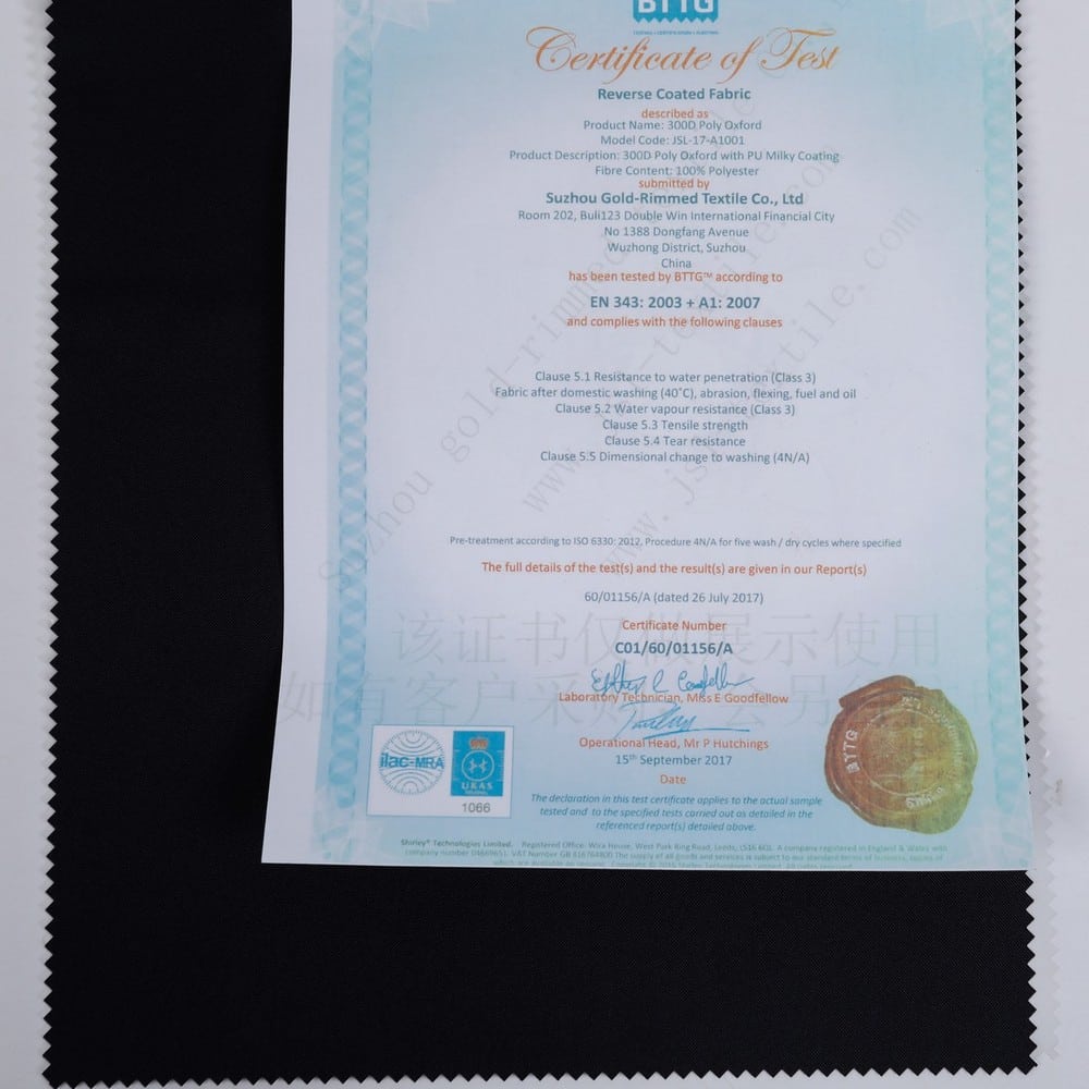 12)Quality Control System: Polyester oxford fabric is EN ISO 20471 certificated/EN343 Class4 in every step (Greige,Dyeing and Finising) must be checked,and every dye lot or finishing lot must be tested in our laboratory or other authorities,we promise only ship goods with good quality.