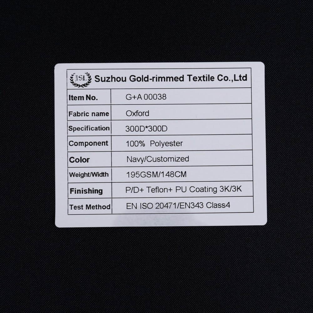 2)Description: 100% polyester oxford fabric with EN ISO 20471/EN343 Class4 certificated P/D+DWR+PU Coating 3K/3K,used for Raincoat,Jacket,Hardshell,Outdoor Clothing,etc.