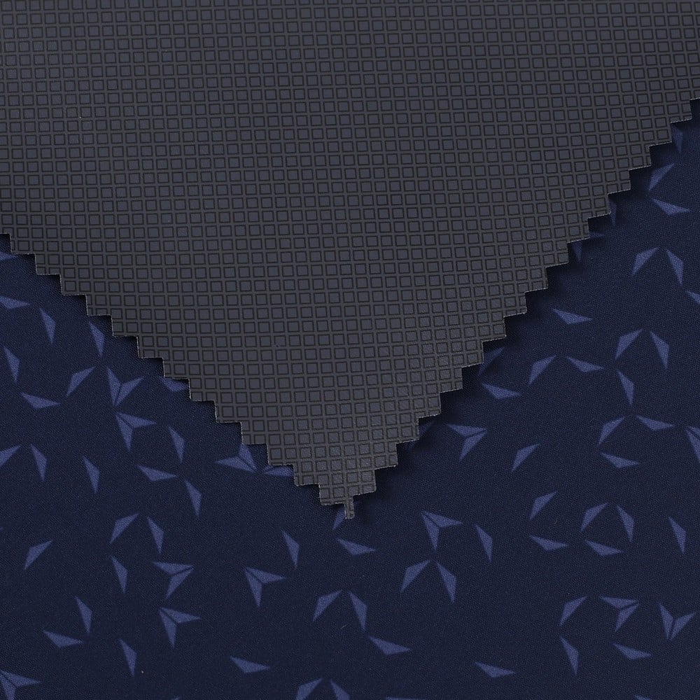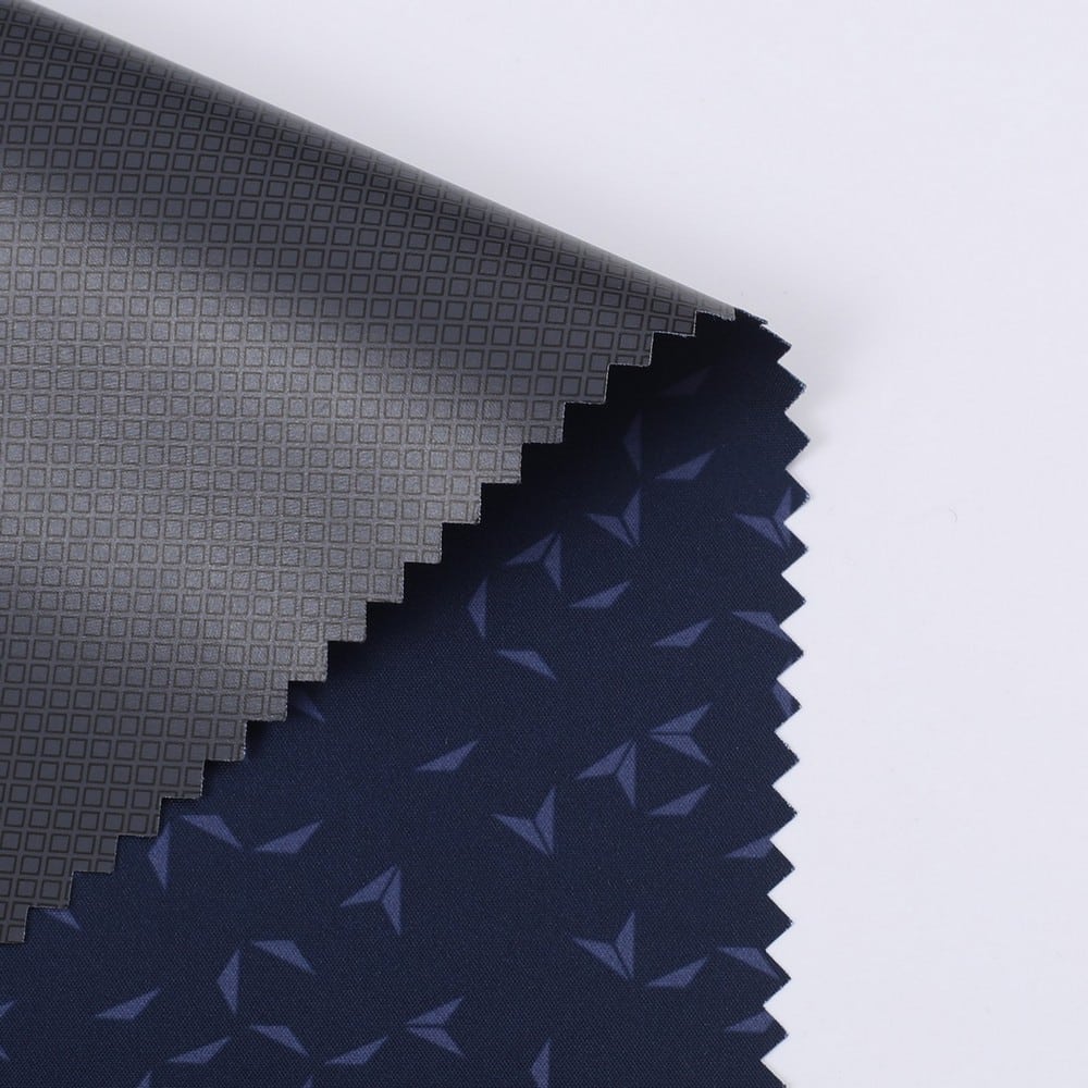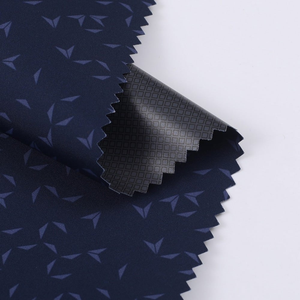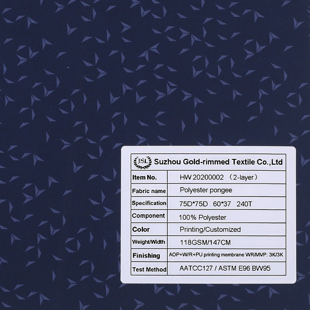 This is 2.5 Layer Polyester pongee fabric with AOP+W/R+PU printing membrane WR/MVP: 3K/3K and meet with ISO 811/ASTM E96 BW95 ,its face material is a Polyester pongee fabric with water-repellent finish,its back material is a waterproof and breathable PU printing membrane WP/MVP: 3K/3K.It is water and wind resistant,waterproof,breathable,durable,ideal for Leisure wear, outerwear, windproof jacket,Anti-UV jacket,etc.