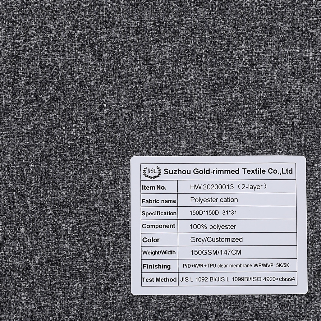 This is a 2-Layer 100% polyester twill cation fabric P/D+W/R+TPU clear membrane WP/MVP: 5K/5K,its face material is a polyester taslan with water-repellence finish,its back material is a Waterproof Breathable TPU membrane,it is water-resistant,waterproof,windproof,breathable,durable,suitable for Shell Jacket,Skiwear,Ski Suit,Outdoor Clothing,etc.