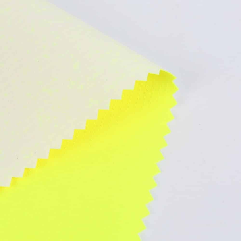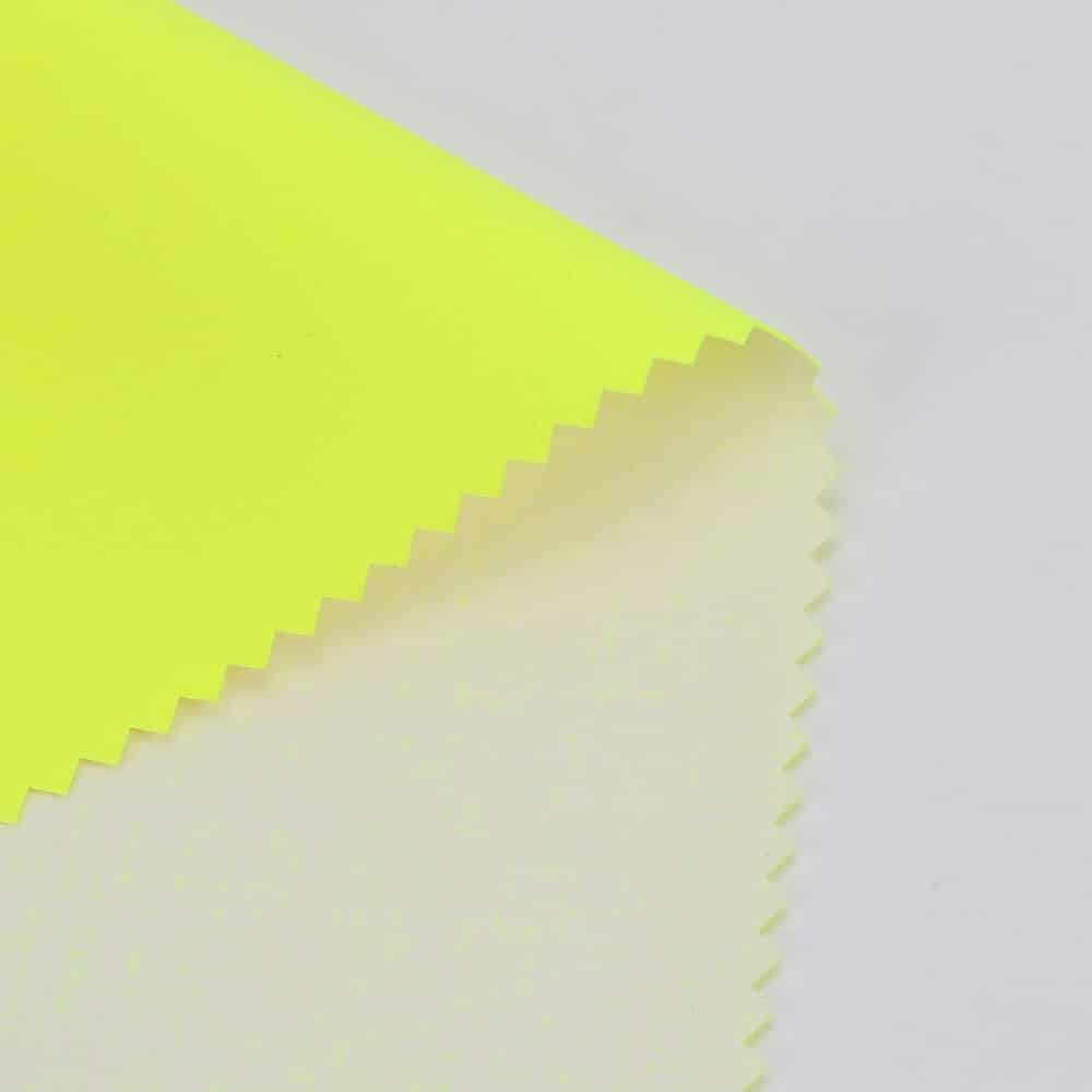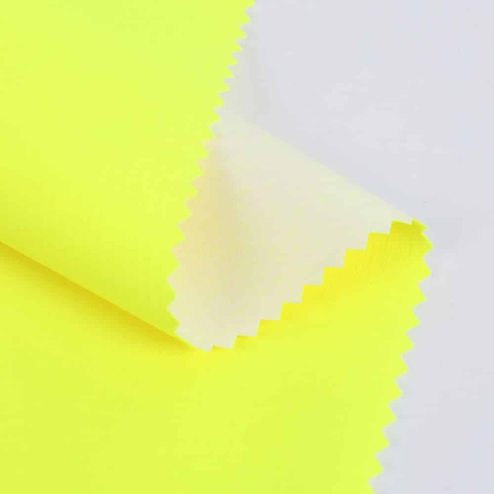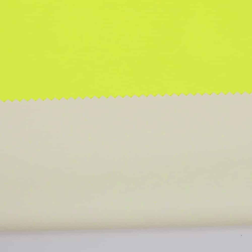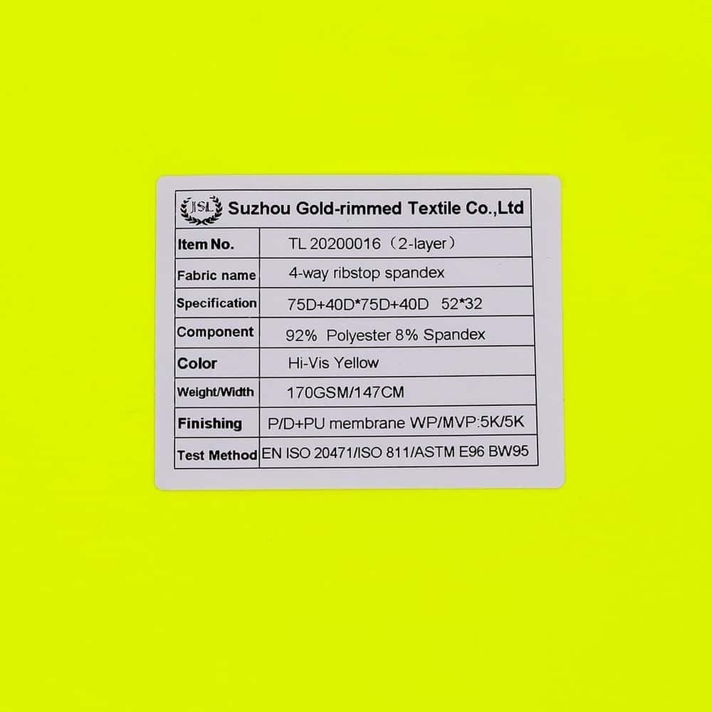 This is 2-Layer 4-way ribstop spandex fabric and meet with EN 20471 ,its face material is a 4-way spandex fabric fluorescent fabric with water-repellent finish,its back material is a waterproof and breathable PU membrane WP/MVP:5K/5K.It is water and wind resistant,waterproof,breathable,durable,ideal for high visibility clothing,workwear,personal protective equipment,etc.