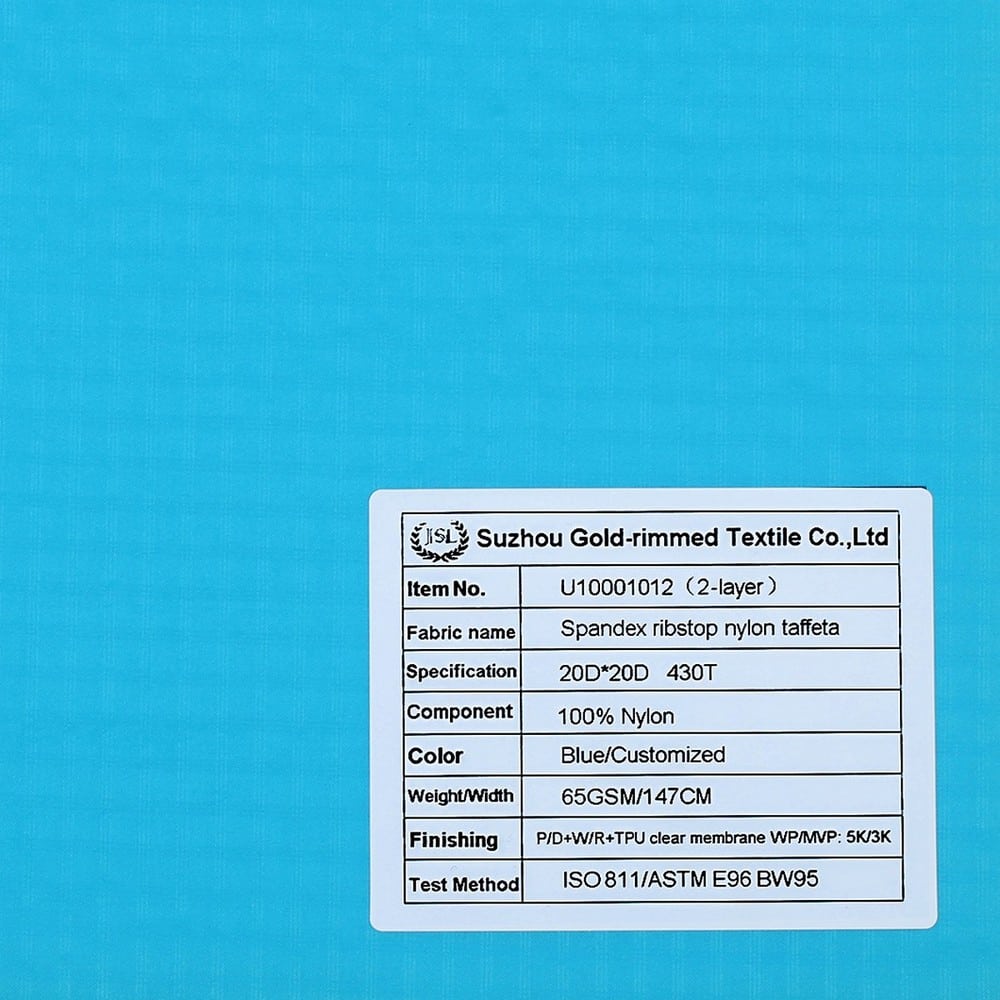This is 2-Layer Spandex ribstop nylon taffeta fabric and meet with ISO 811/ASTM E96 BW95 ,its face material is a super thin Spandex ribstop nylon taffeta fabric with water-repellent finish,its back material is a waterproof and breathable TPU membrane WP/MVP:5K/3K.It is super thin, water and wind resistant,waterproof,breathable,durable,ideal for Leisure wear, outerwear, windproof jacket,Anti-UV jacket,etc.