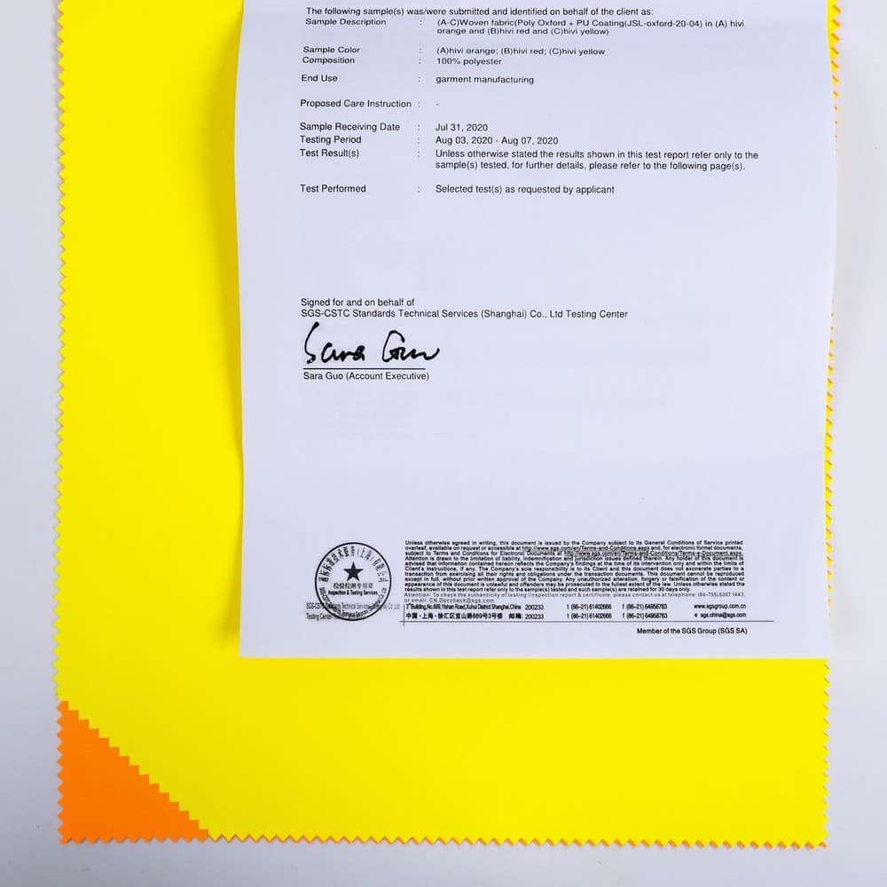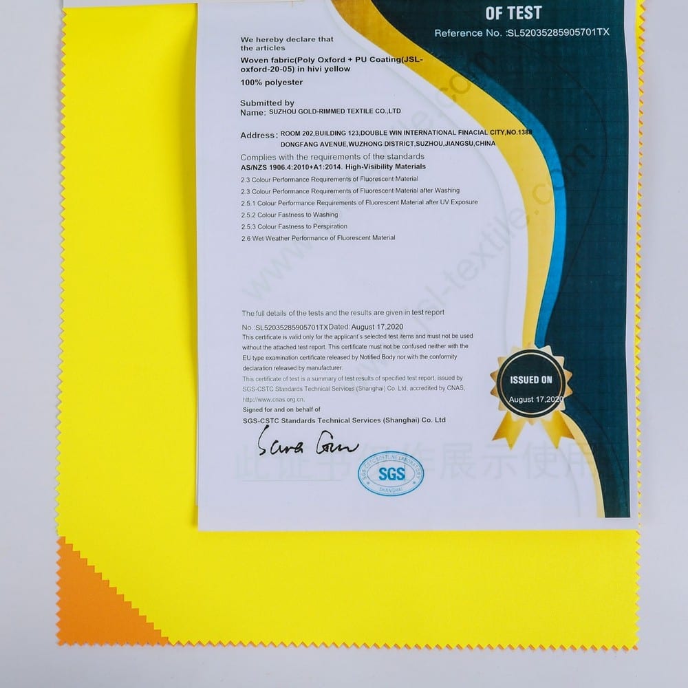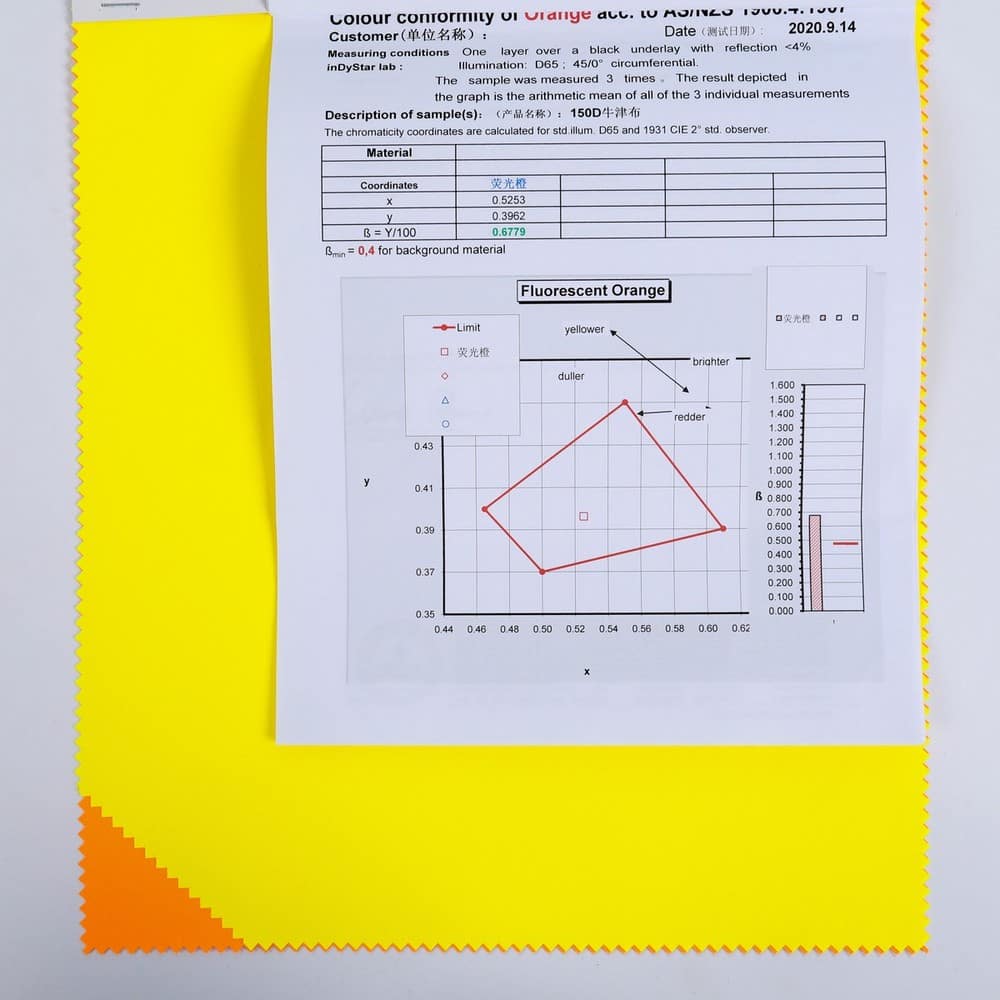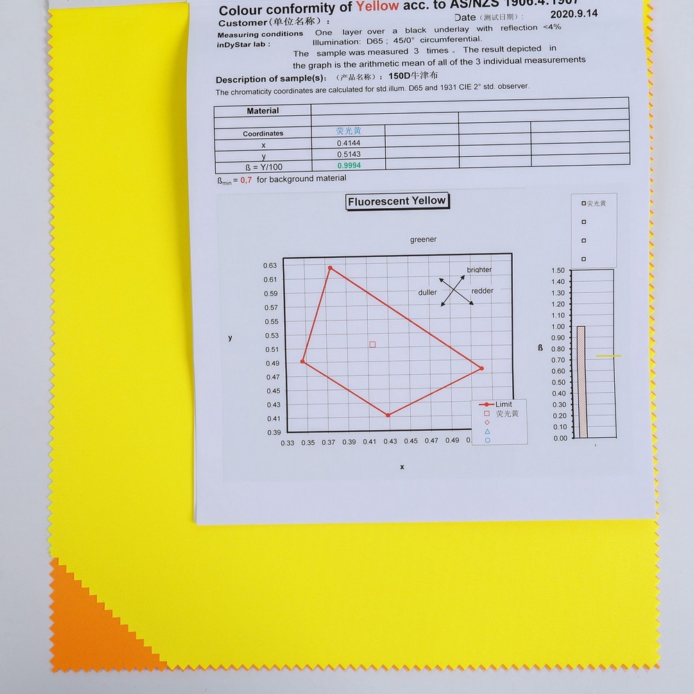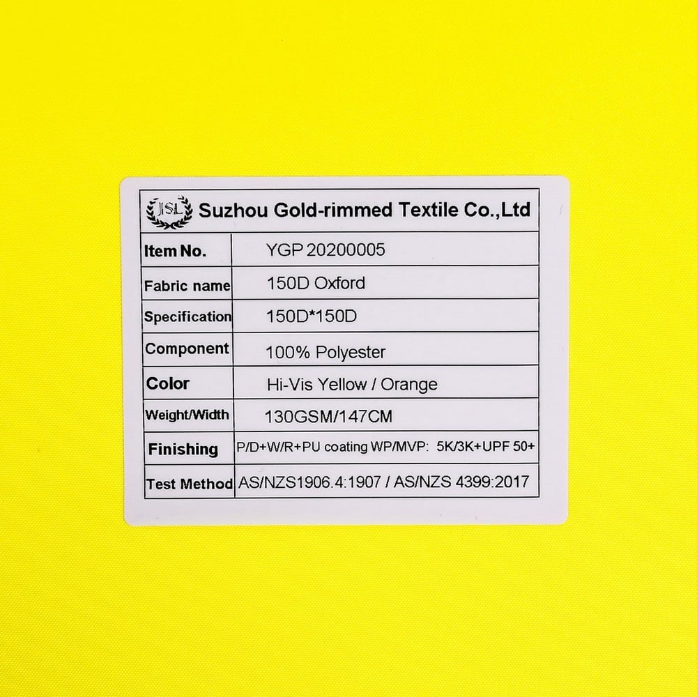 This is 150D 100% Polyester Oxford fabric and meet with AS/NZS1906.4:1907 / AS/NZS 4399:2017 ,its face material is a polyester oxford fluorescent and anti-uv fabric with water-repellent finish,its back material is a waterproof and breathable PU coating.It is water and wind resistant,waterproof,breathable,anti-uv,durable,ideal for high visibility clothing,workwear,personal protective equipment,etc.