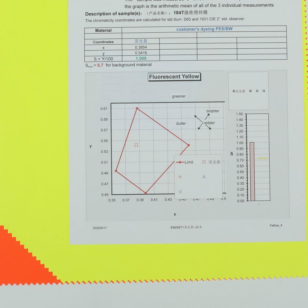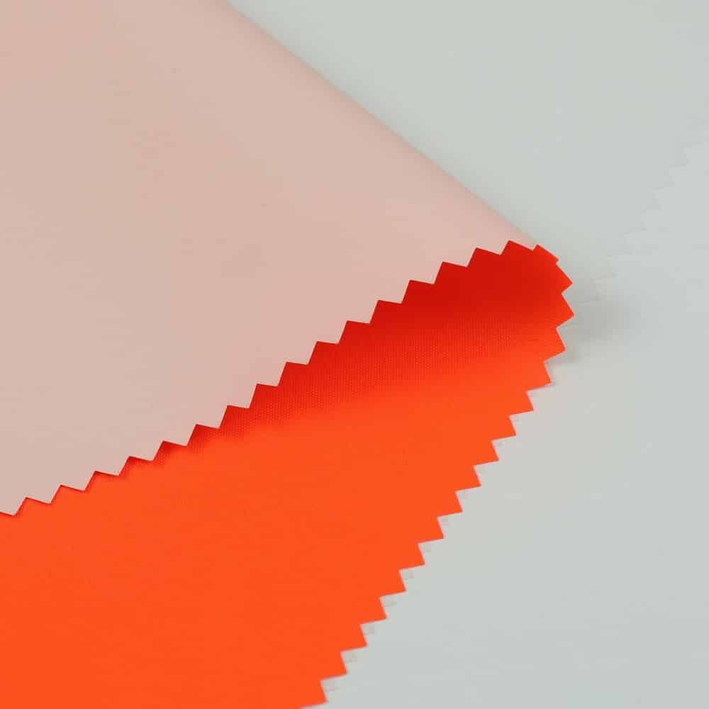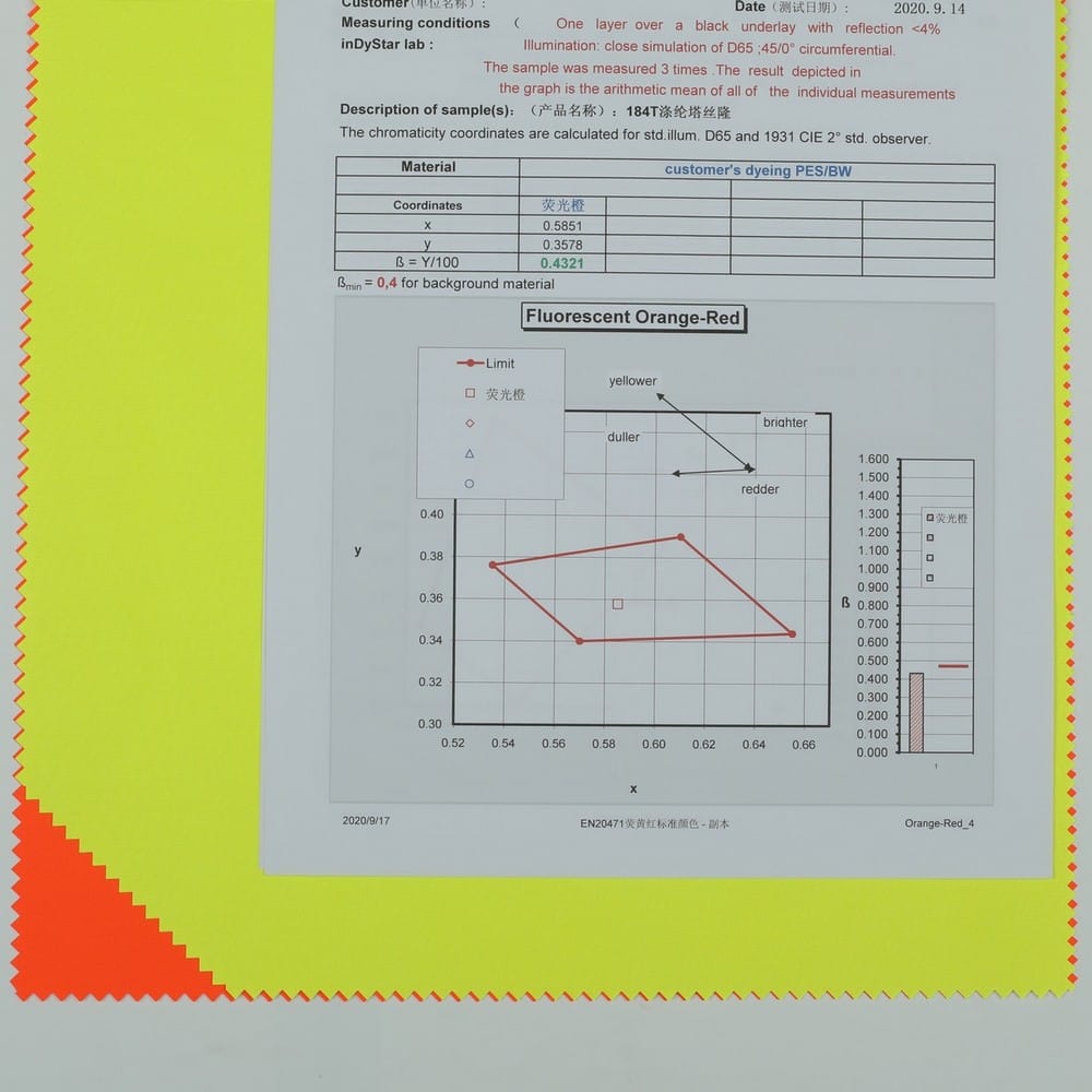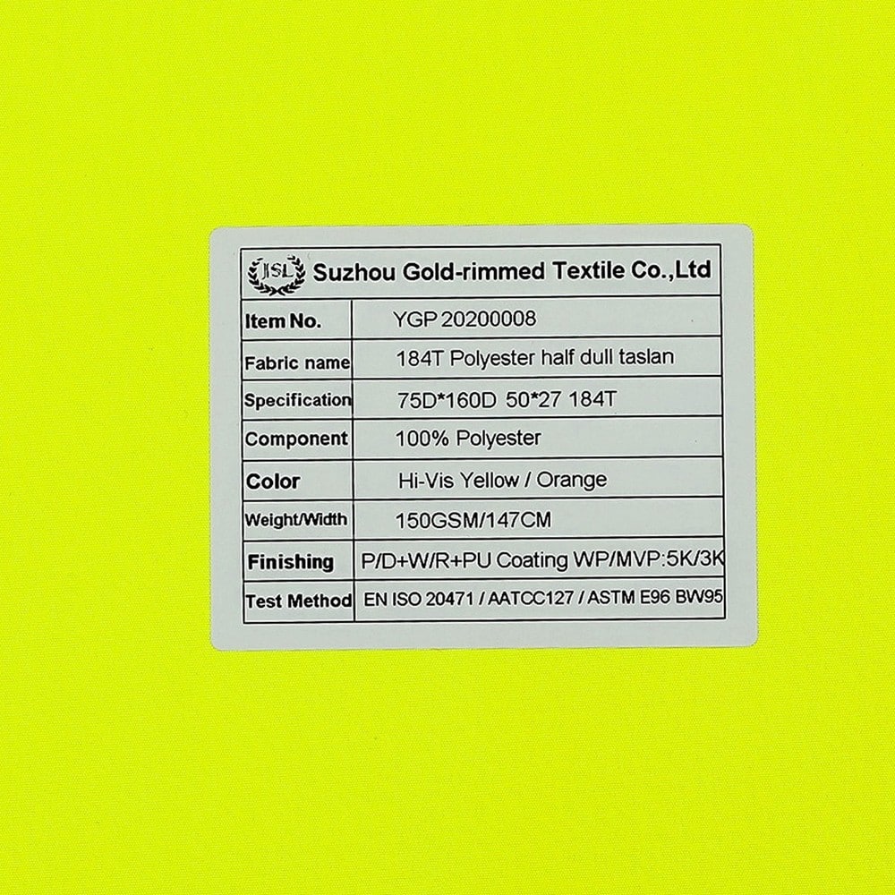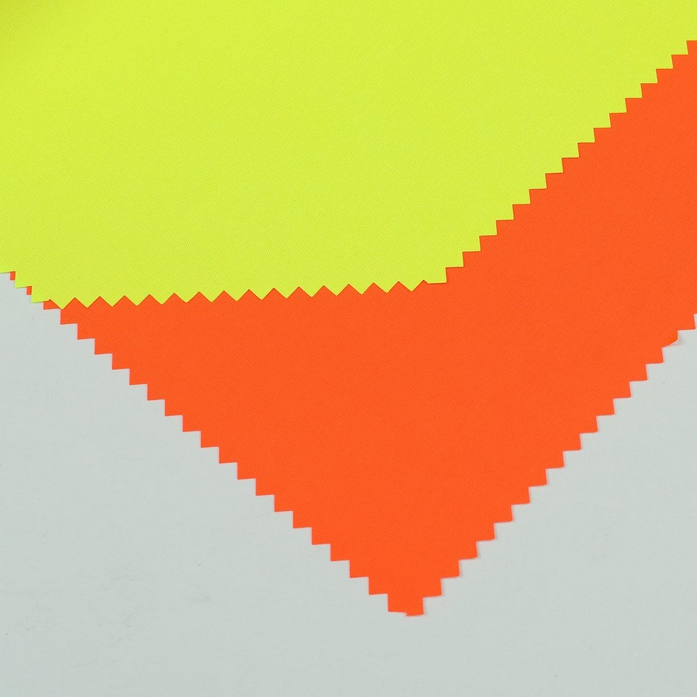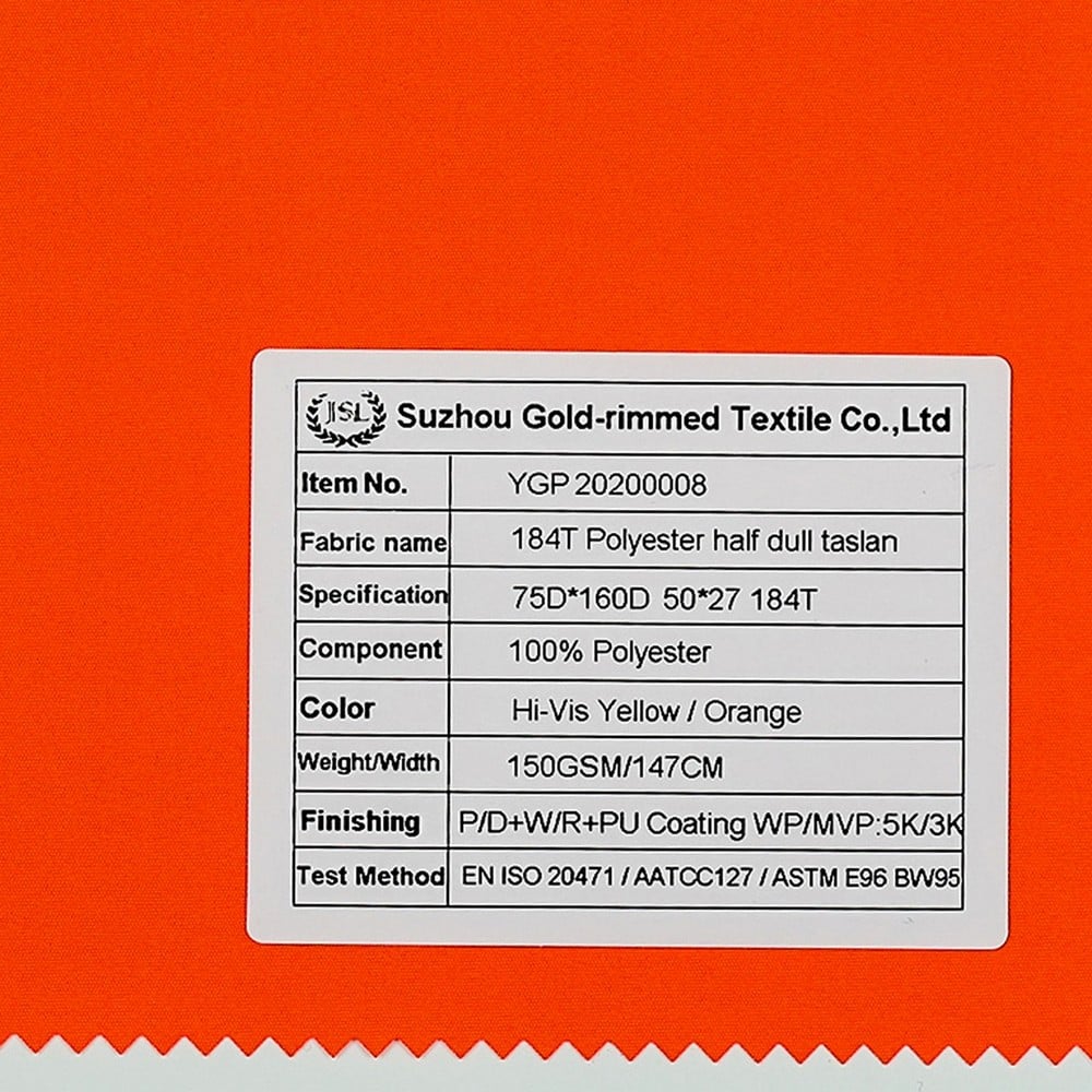 This is 184T Polyester half dull taslan fabric and meet with EN 20471 ,its face material is 184T Polyester half dull taslan fluorescent fabric with water-repellent finish,its back finishing is a waterproof and breathable PU Coating WP/MVP:5K/3K.It is water and wind resistant,waterproof,breathable,durable,ideal for high visibility clothing,workwear,personal protective equipment,etc.