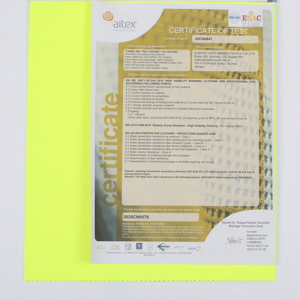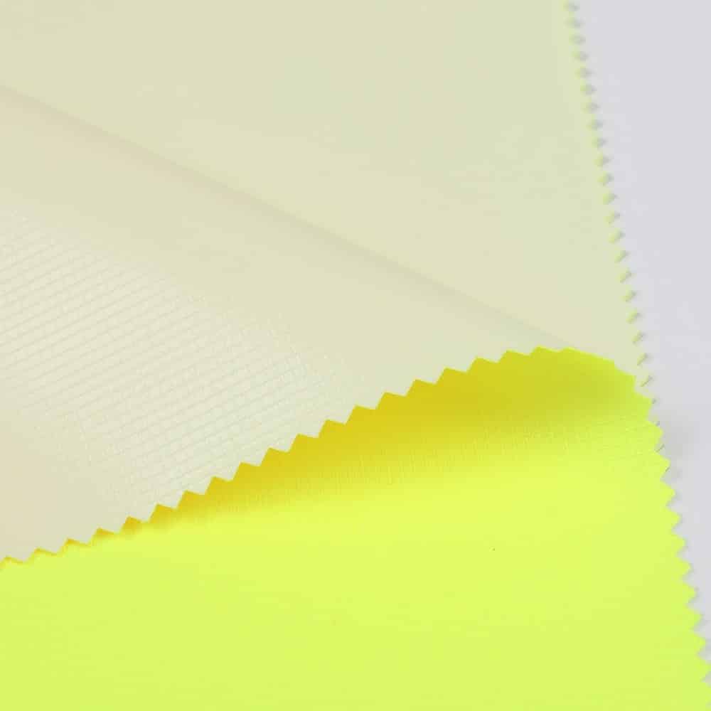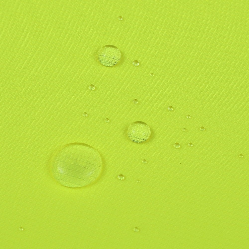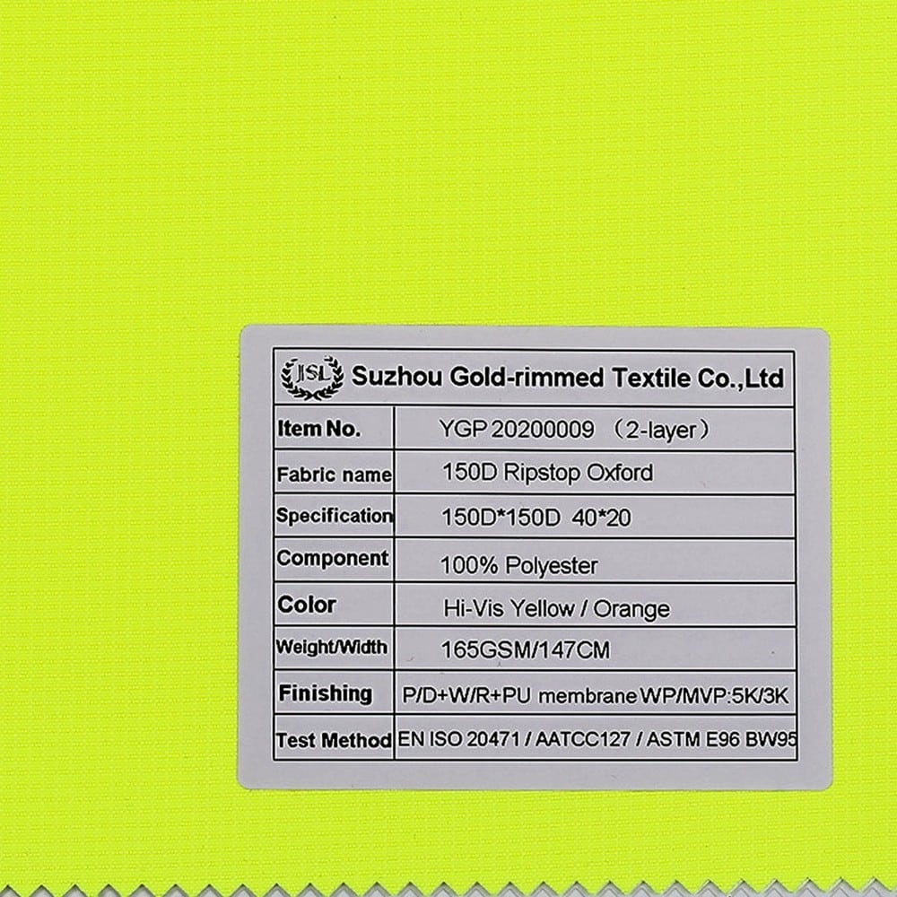 This is 2-Layer 150D ripstop polyester oxford fabric and meet with EN 20471 ,its face material is a 150D ripstop polyester oxford fluorescent fabric with water-repellent finish,its back material is a waterproof and breathable PU membrane WP/MVP:5K/3K.It is water and wind resistant,waterproof,breathable,durable,ideal for high visibility clothing,workwear,personal protective equipment,etc.