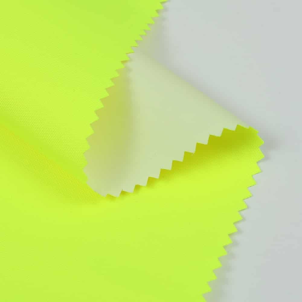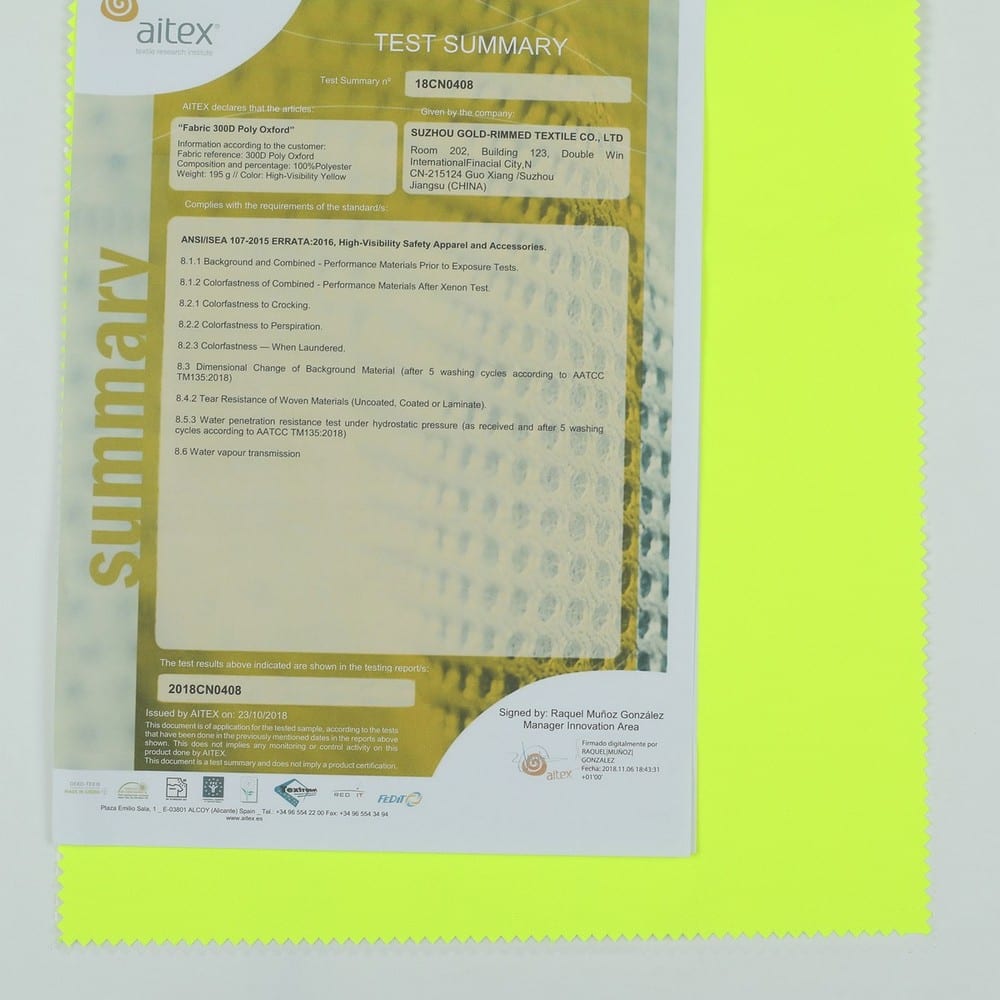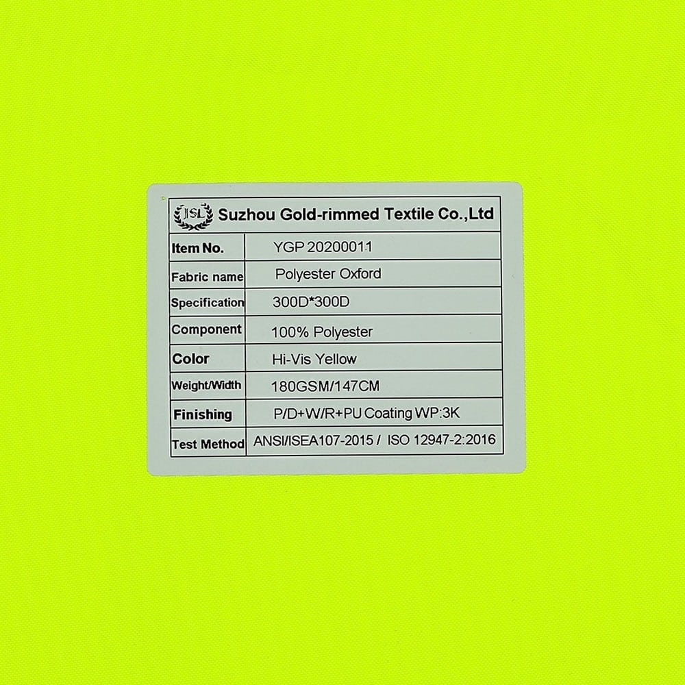 This is 300D polyester oxford fabric and meet with EN 20471 ,its face material is a 300D ripstop polyester oxford fluorescent fabric with water-repellent finish,its back material is a waterproof and breathable PU Coating WP:3K.It is water and wind resistant,waterproof,breathable,durable,ideal for high visibility clothing,workwear,personal protective equipment,etc.