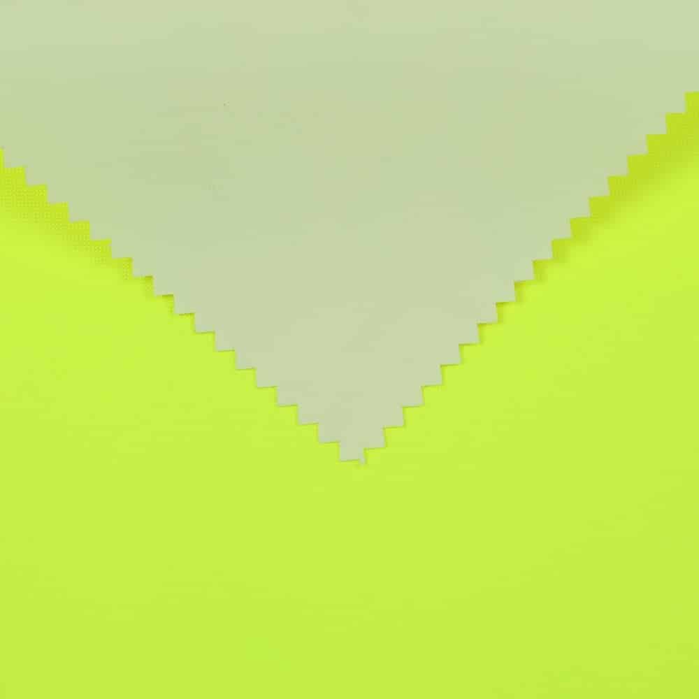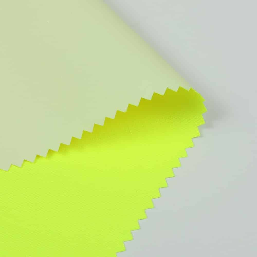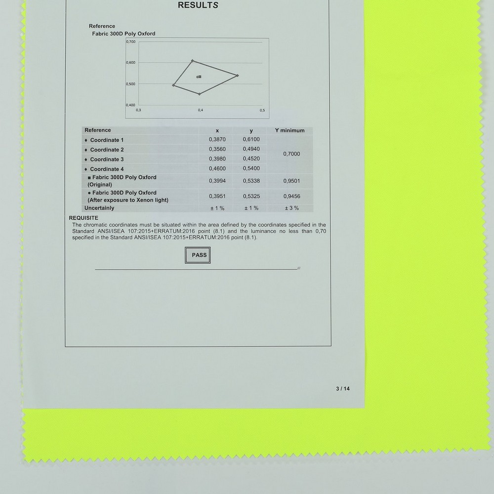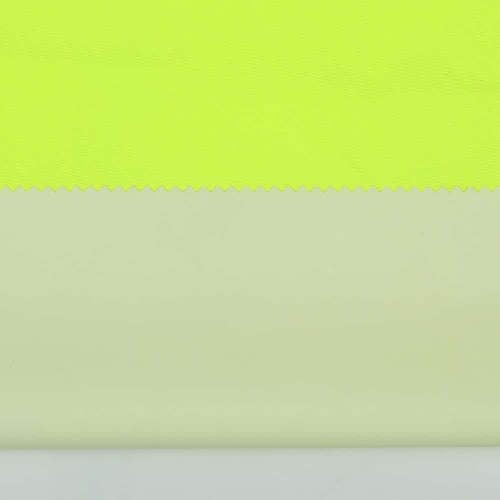 This is 300D polyester oxford fabric and meet with EN 20471 ,its face material is a 300D ripstop polyester oxford fluorescent fabric with water-repellent finish,its back material is a waterproof and breathable PU Coating WP:3K.It is water and wind resistant,waterproof,breathable,durable,ideal for high visibility clothing,workwear,personal protective equipment,etc.
