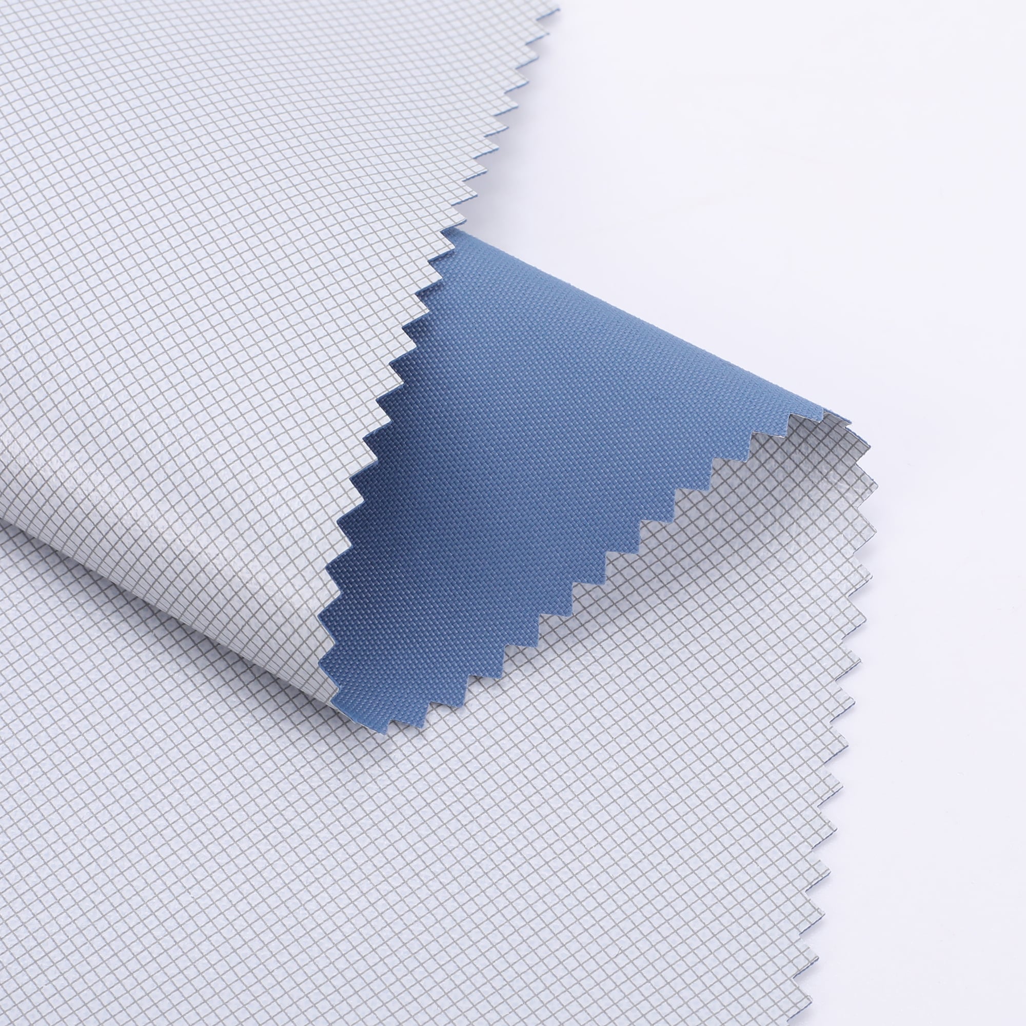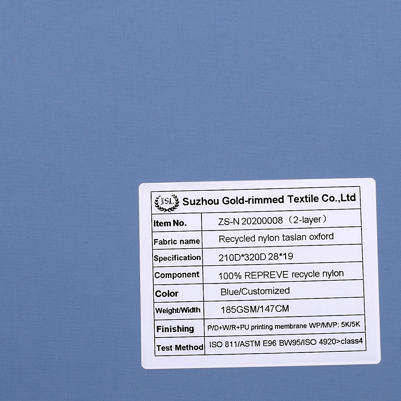2)Description: Recycled nylon taslan oxford fabric with GRS certificated P/D+W/R+PU printing membrane WP/MVP: 5K/5K,used for Jacket,Hardshell,Outdoor Clothing,etc.