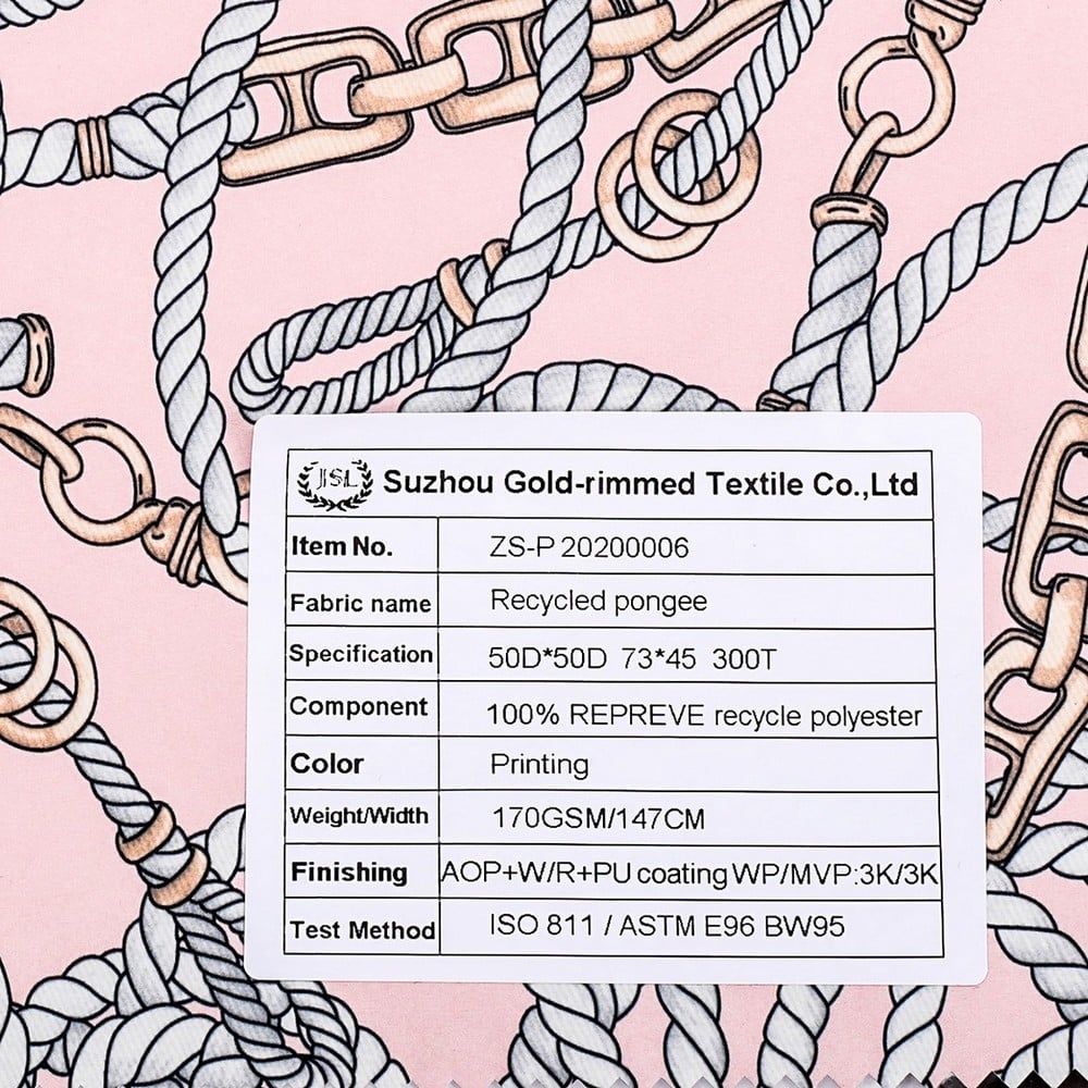2)Description: Recycled polyester pongee fabric with GRS certificated AOP+W/R+PU coating WP/MVP: 3K/3K,used for Jacket,Hardshell,Outdoor Clothing,etc.