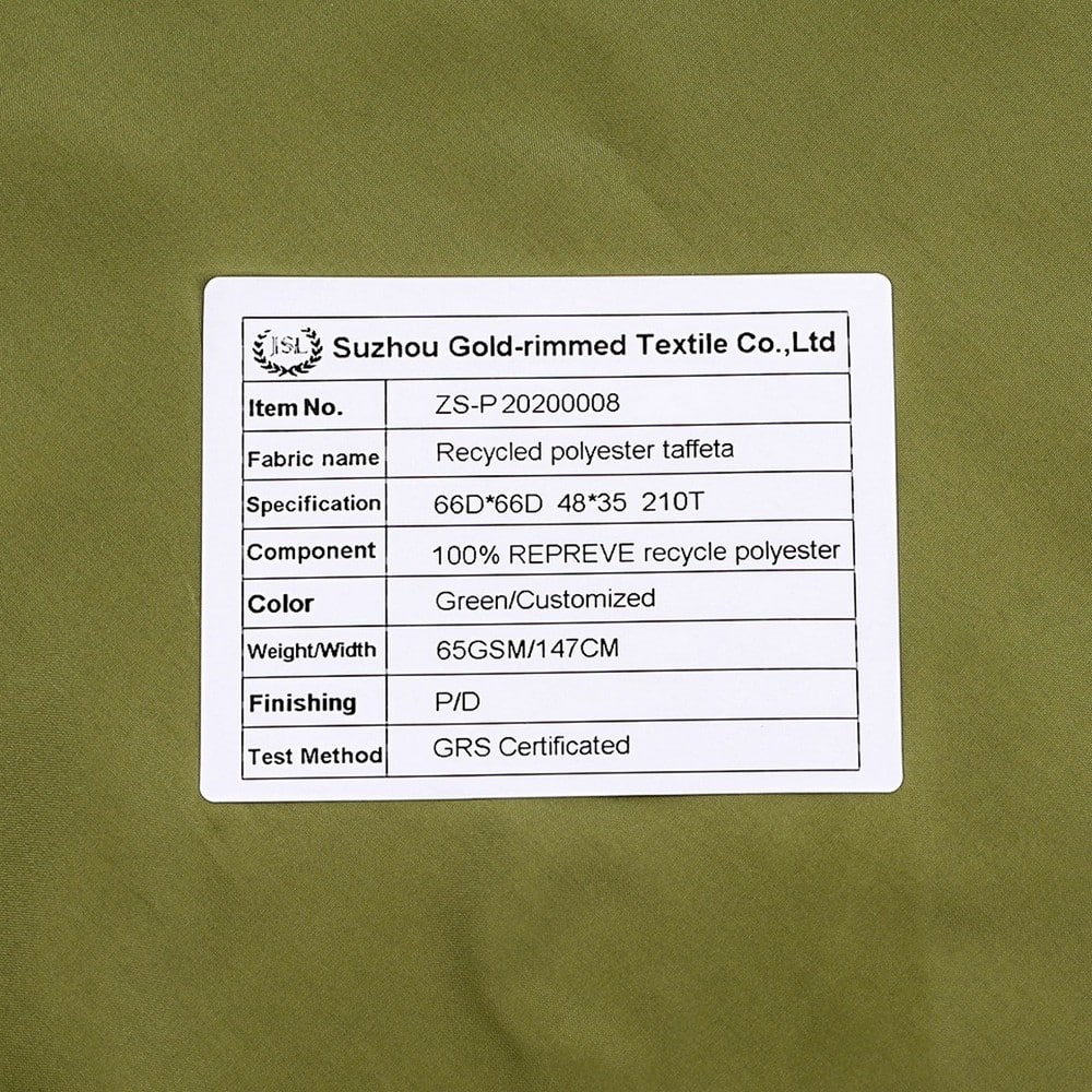 This is a Recycled polyester taffeta Fabric,its face material is a Recycled polyester taffeta Fabric with water-repellent finish, ideal for jacket,outerwear,lining etc.It can customize with finishing printing, coating, laminated.